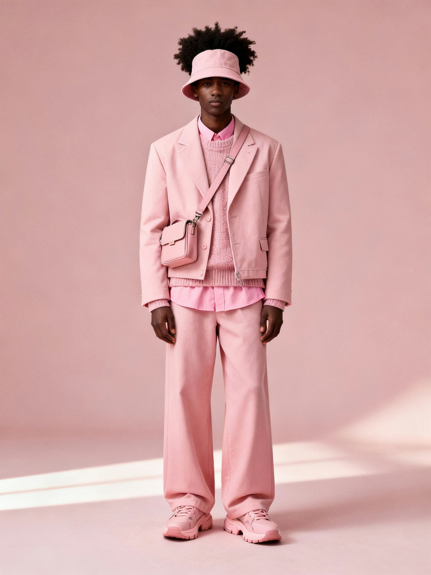 A stylish individual in a pink monochromatic outfit, featuring a blazer, sweater, trousers, and accessories, against a soft pink background.