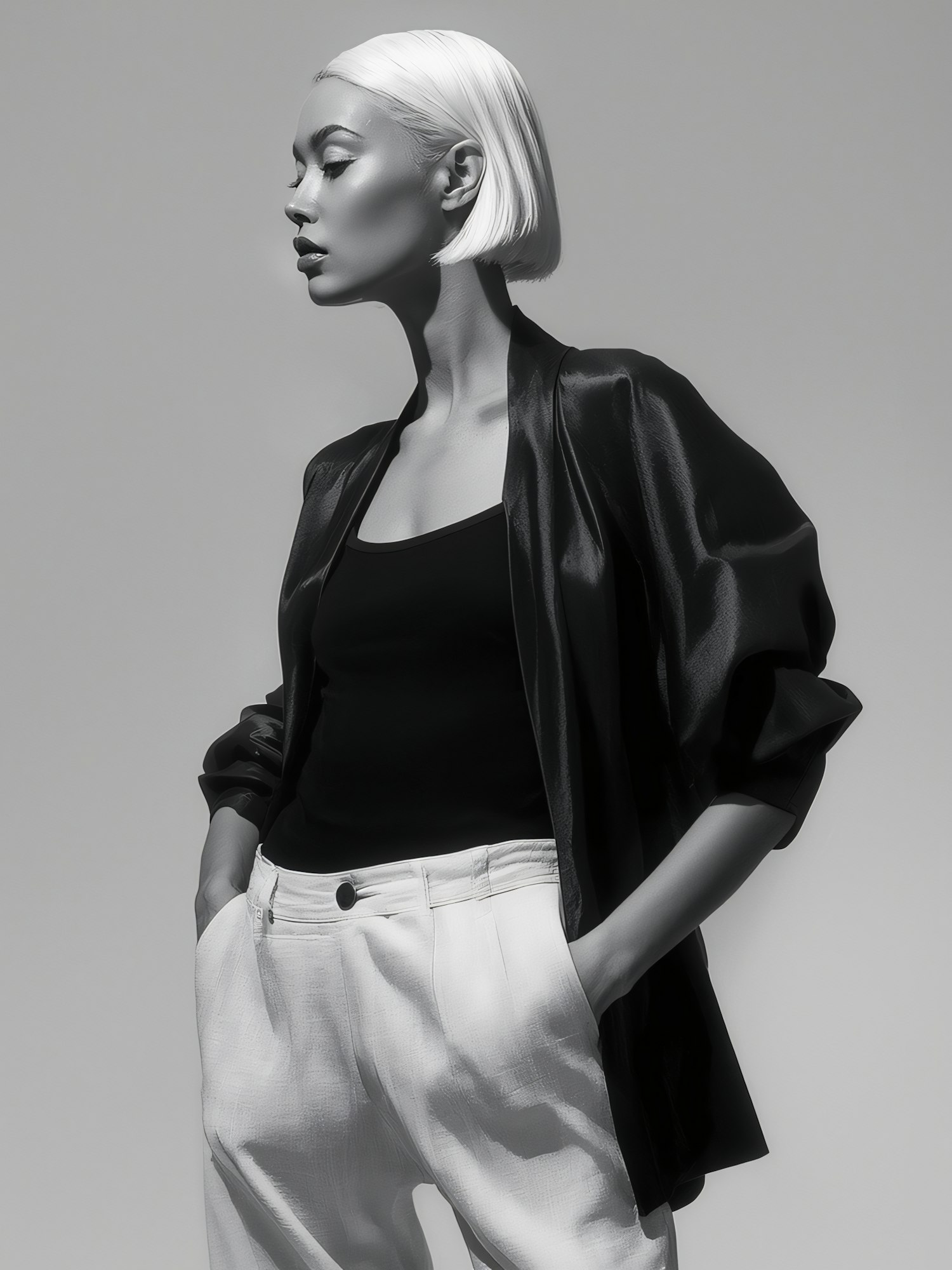 Monochrome portrait of a stylish individual in a black top, white trousers, and a flowing jacket, with sleek short hair.