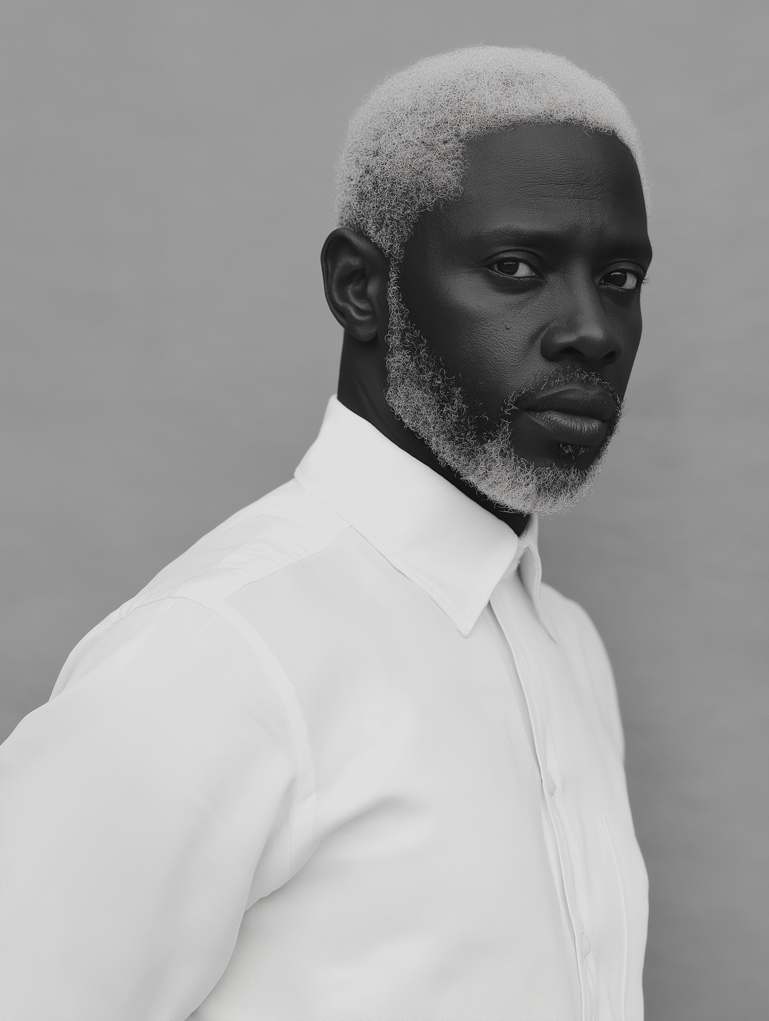 Monochromatic image of a handsome older man with dark skin and white hair in a formal shirt against a neutral gray background.