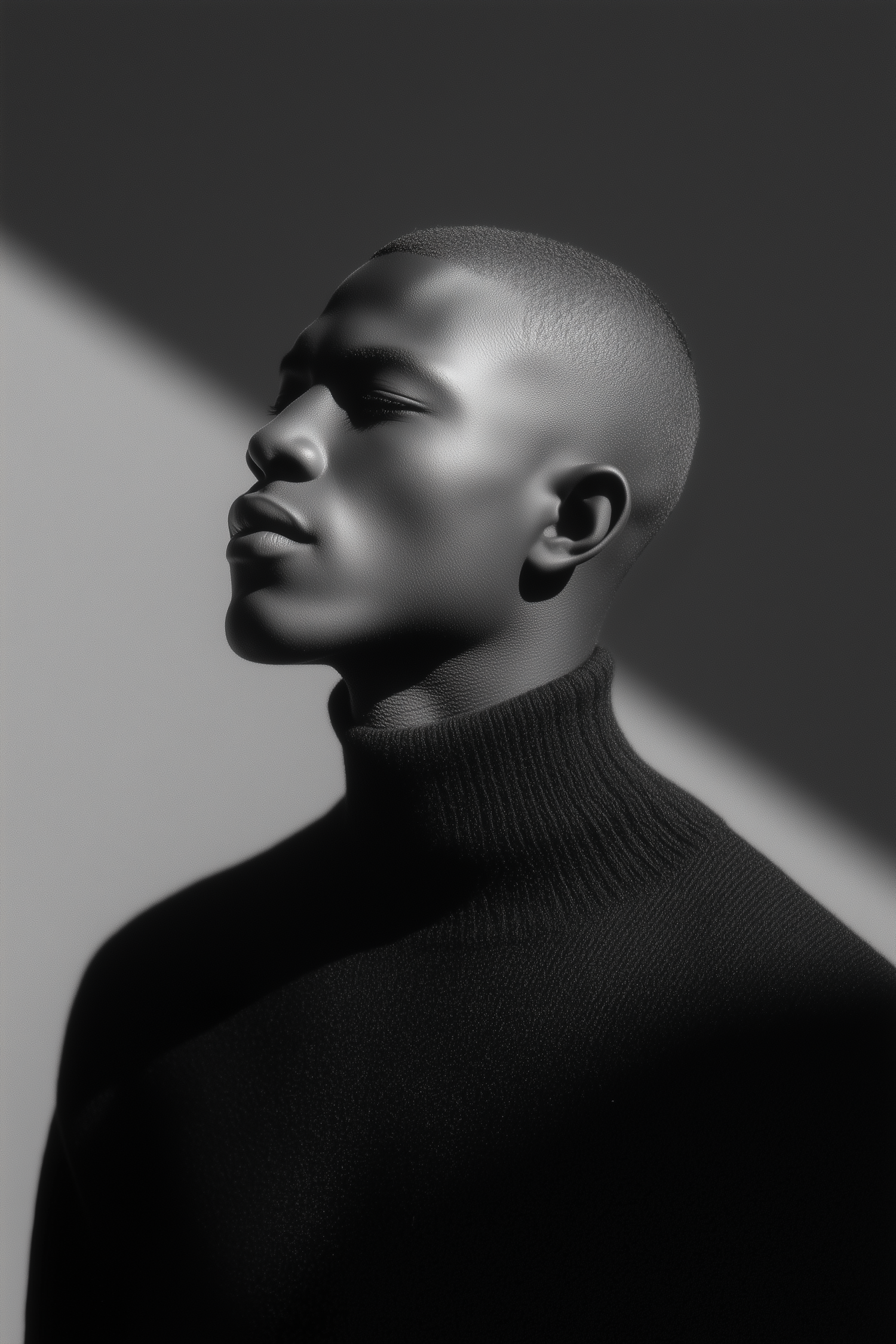 A striking black-and-white portrait of a person in a high-neck sweater, with dramatic lighting emphasizing contours and textures.