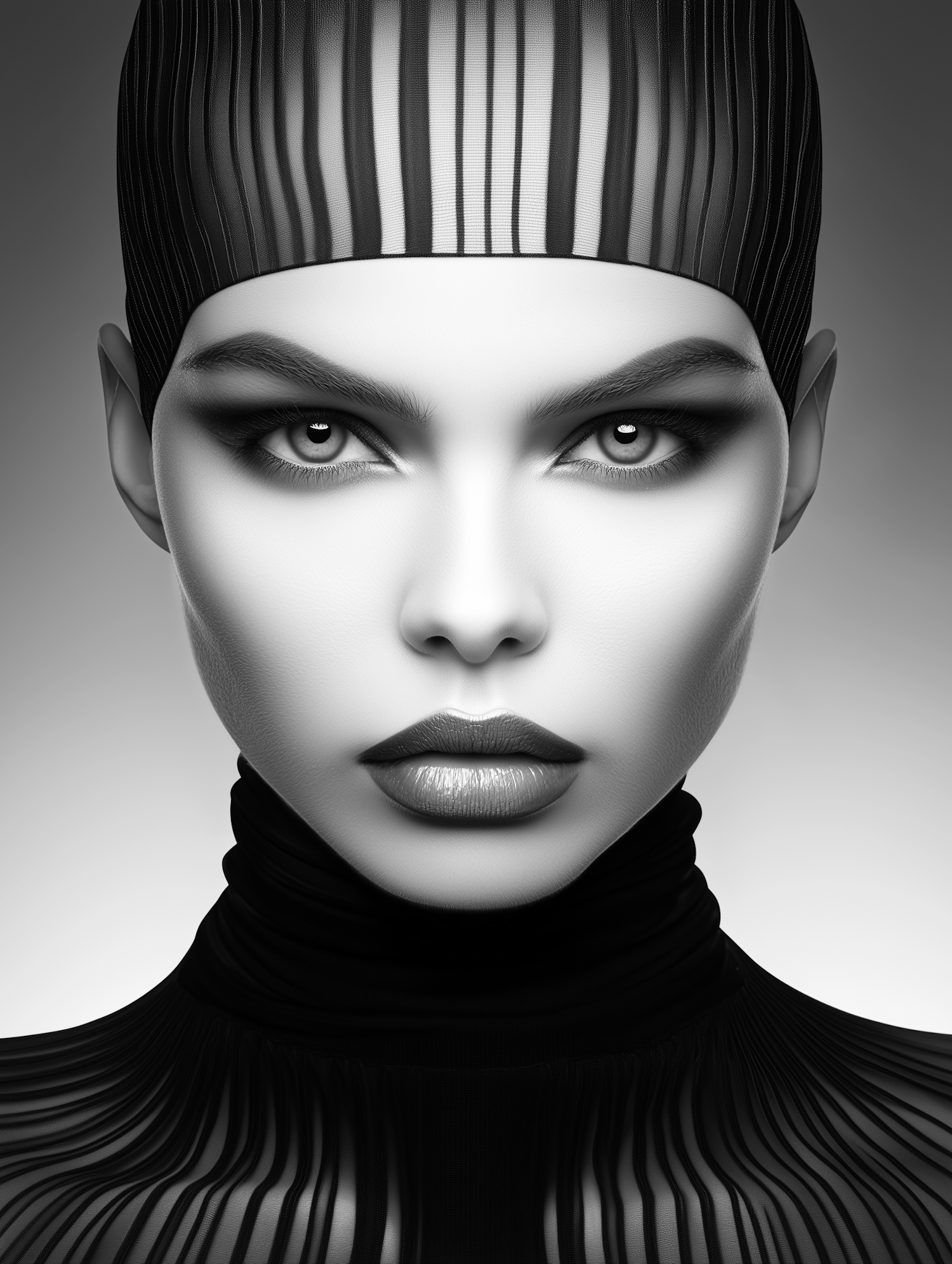 Futuristic black and white portrait of a woman with intense eyes, bold eyebrows, and striped attire, exuding elegance and modernity.