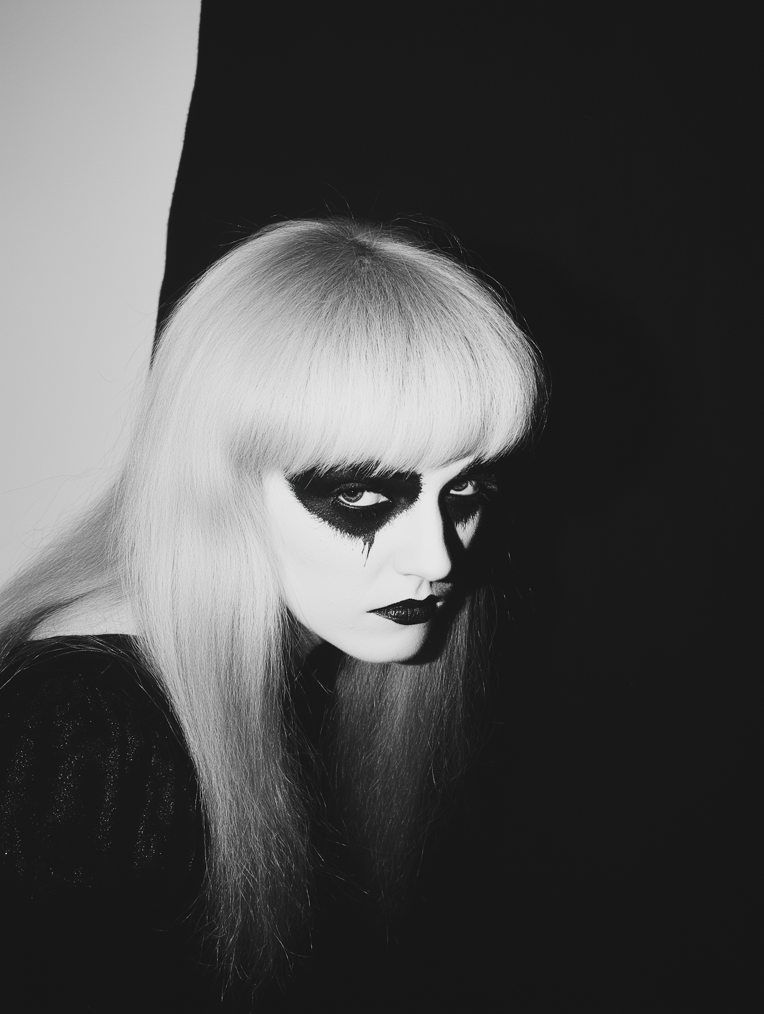 Striking black-and-white portrait of a person with bold makeup and light hair, set against a high-contrast background.