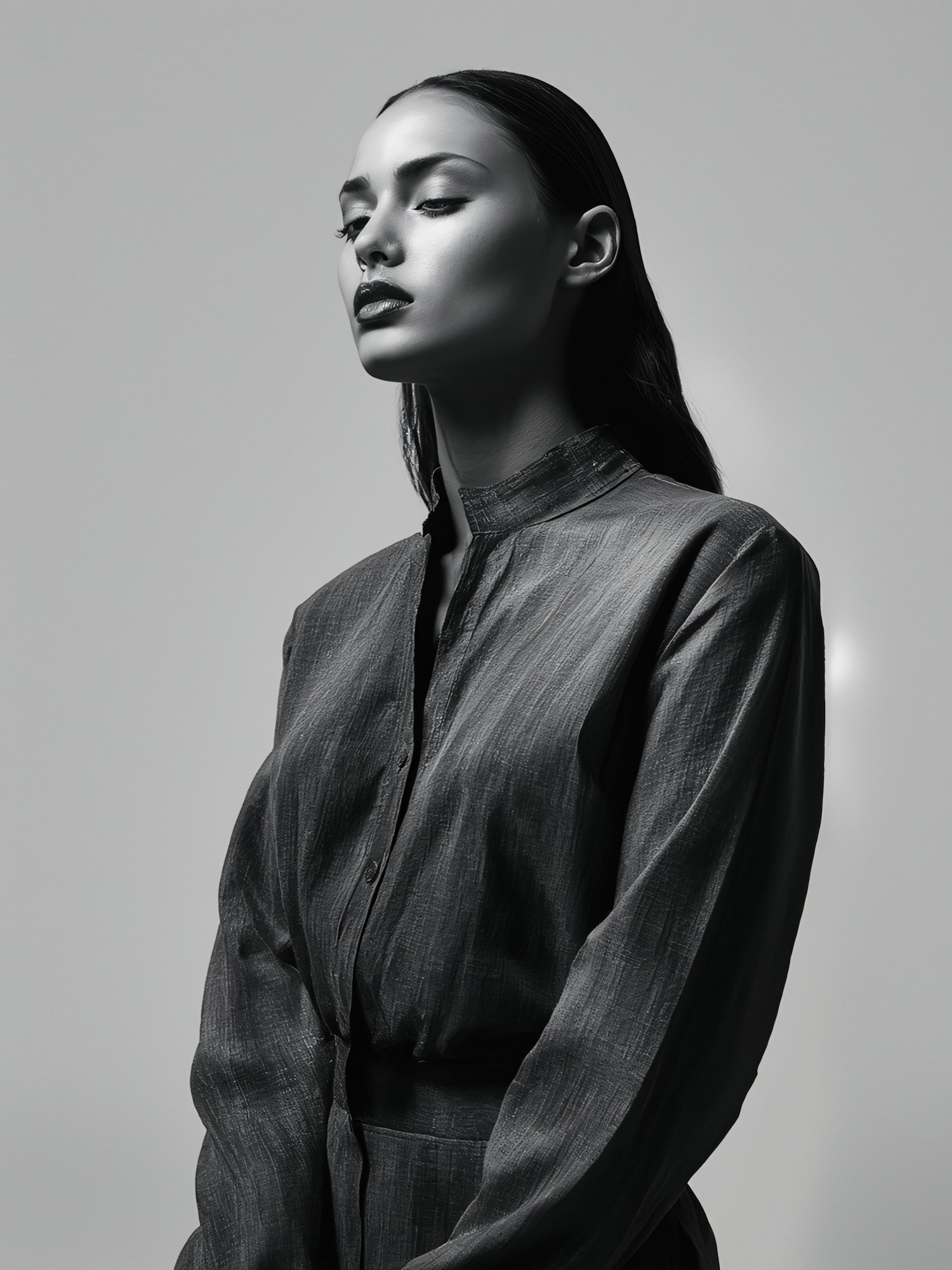 Monochrome portrait of a woman with sleek hair and a textured outfit, showcasing serene expression and dramatic lighting.