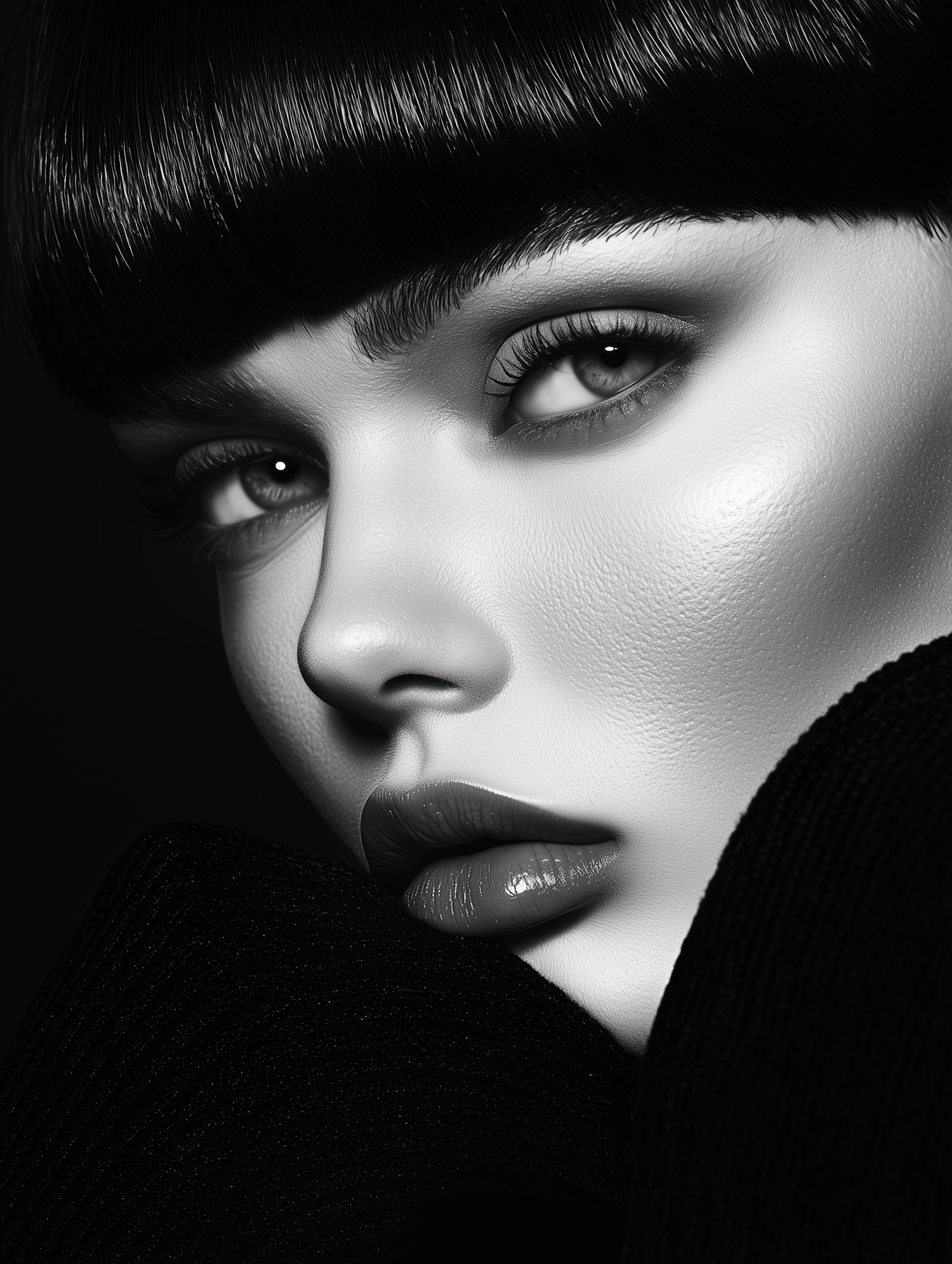 Black and white close-up portrait with intense gaze, glossy hair, and full lips, creating a striking and elegant look.