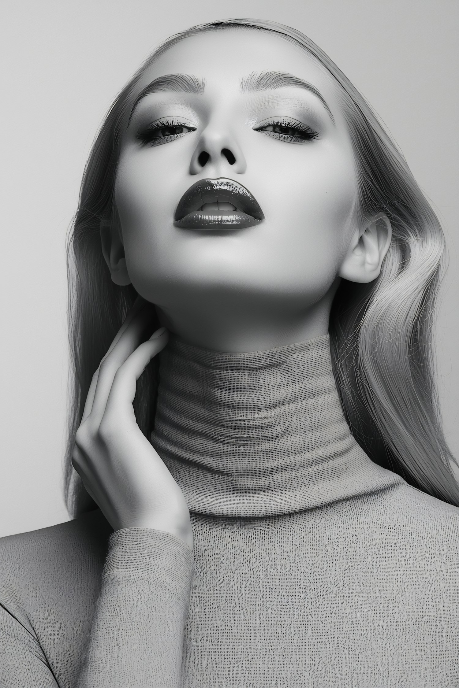 Monochromatic portrait of a person with light skin tone, glossy lips, and a high-neck garment, showcasing a poised and elegant expression.
