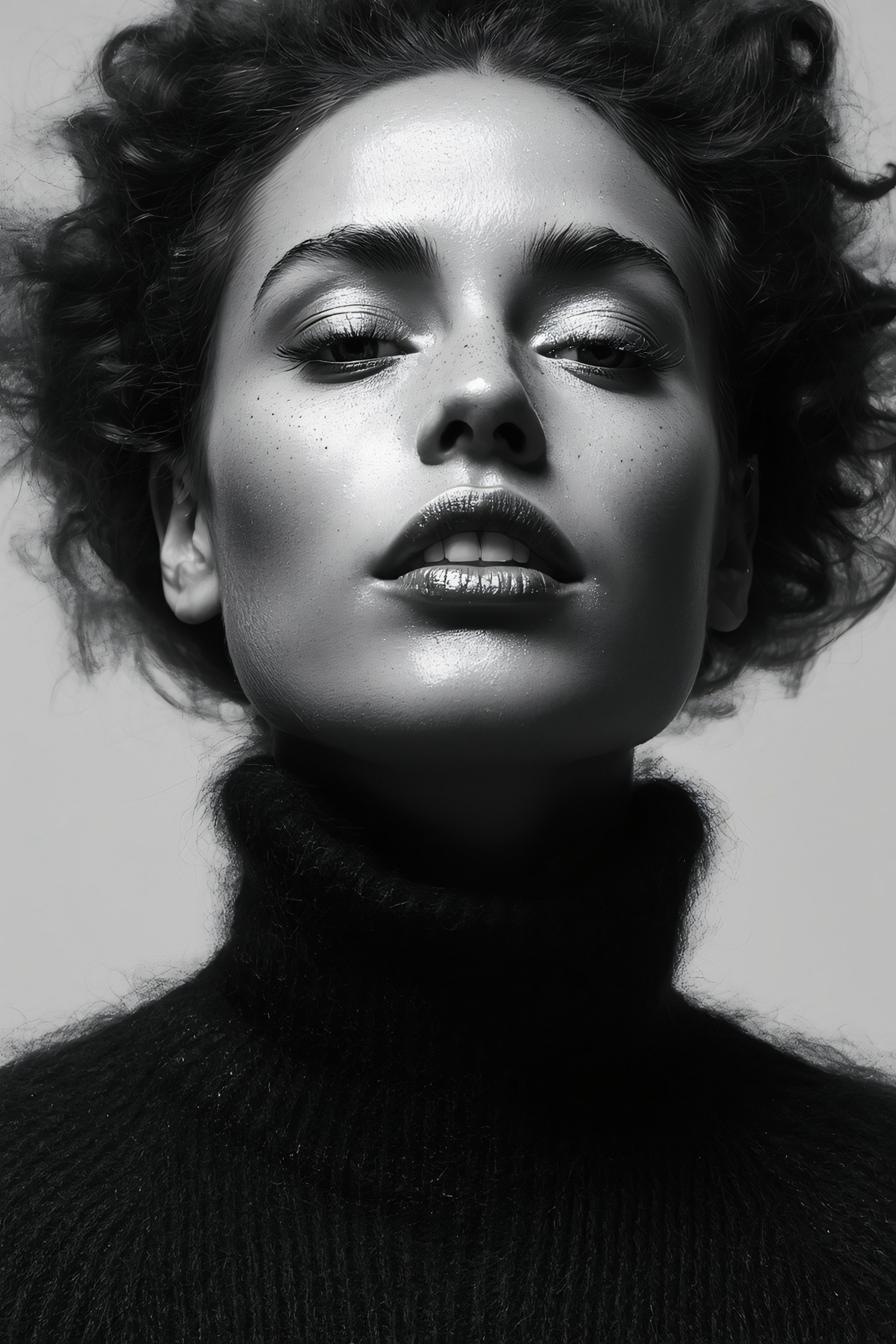 Monochromatic portrait of a person with curly hair and a dark turtleneck, featuring dramatic lighting and a neutral expression.