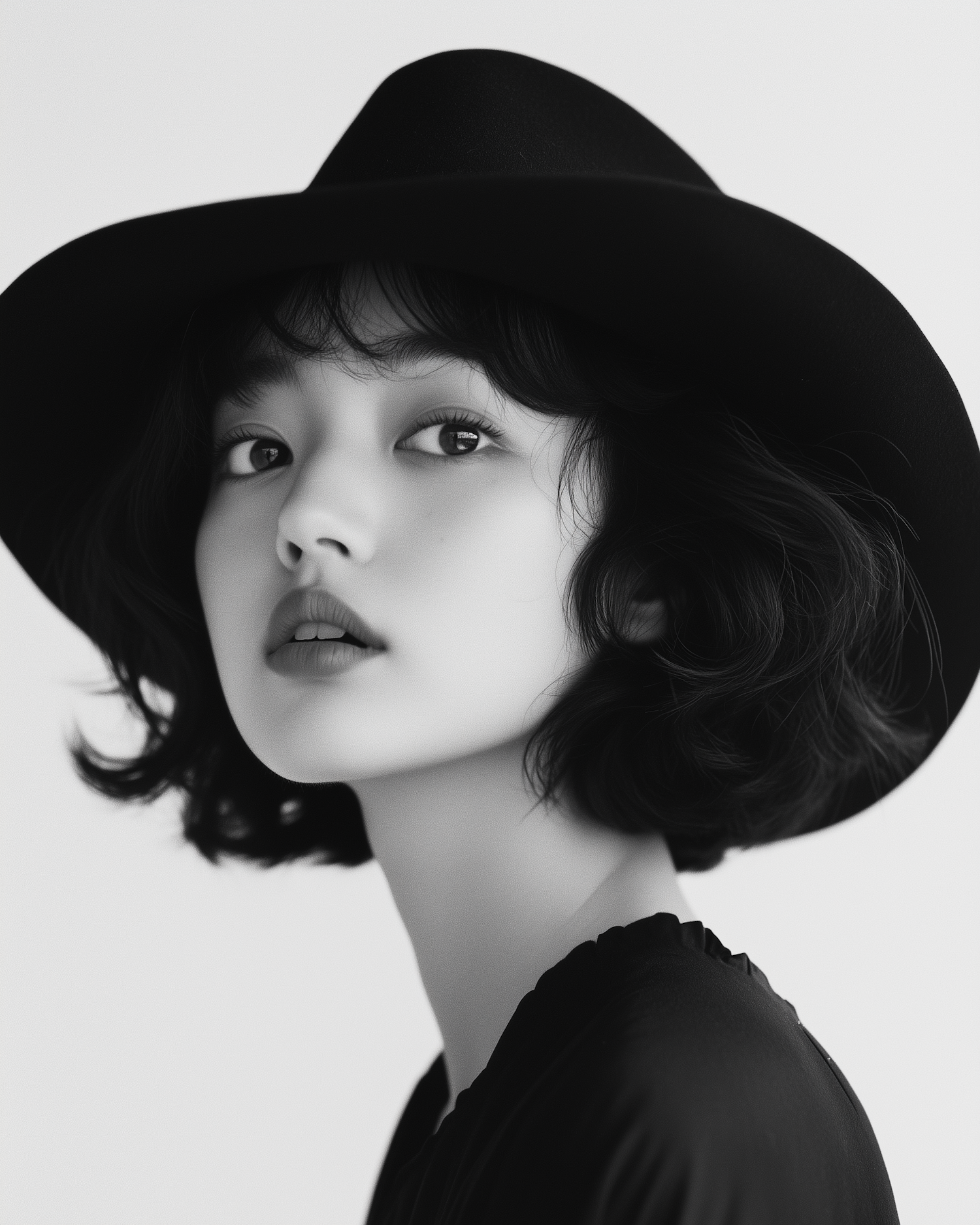 Elegant black and white portrait of a woman in a wide-brimmed hat, exuding timeless style and introspection.