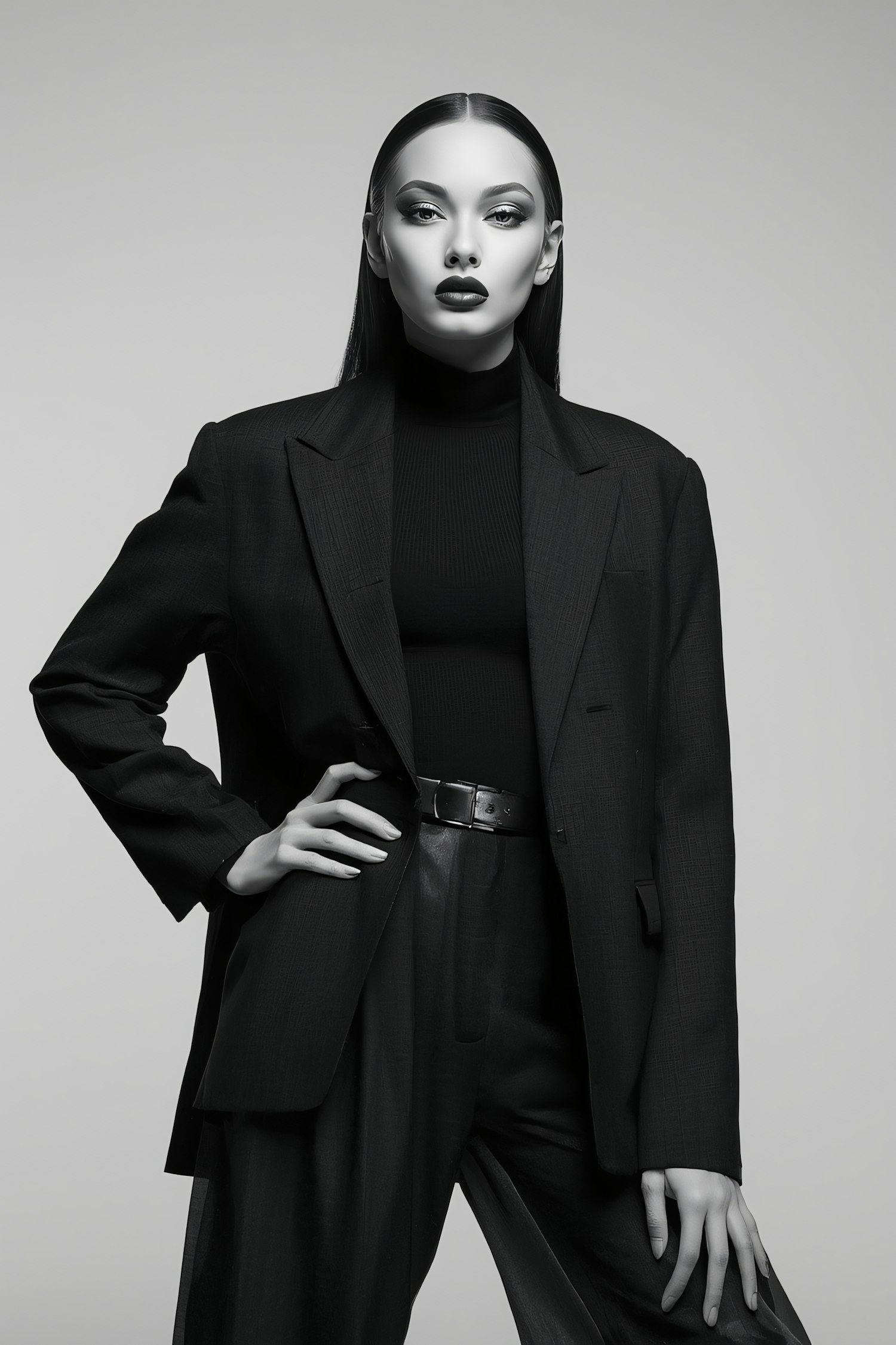 Monochrome portrait of a person in a tailored black suit, exuding elegance and confidence with bold makeup and sleek styling.