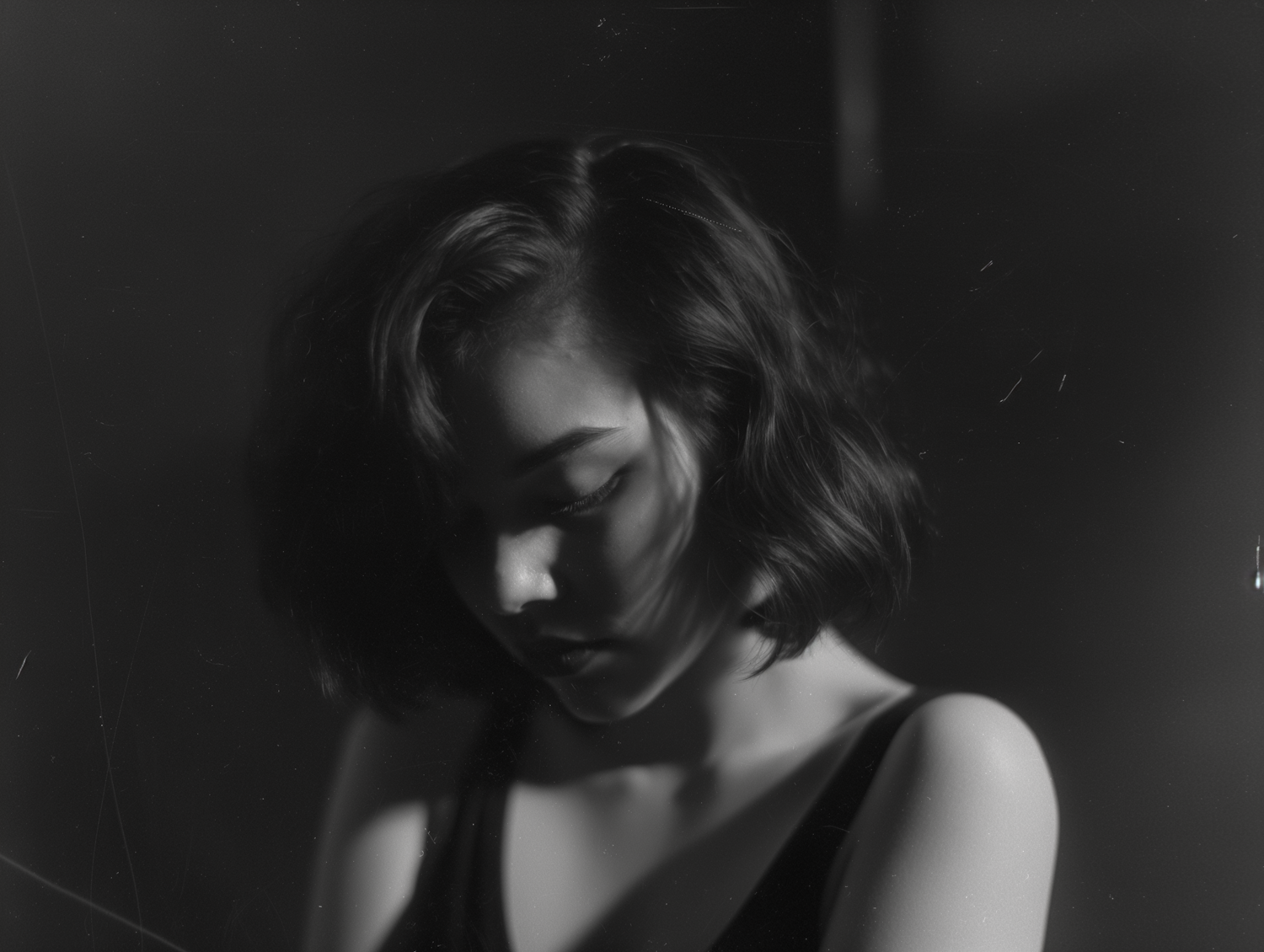 Black and white portrait of a young woman with short wavy hair, looking down in a contemplative pose.