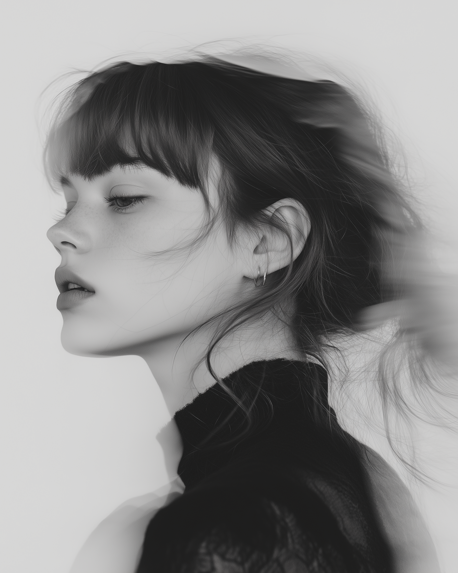 Black-and-white portrait of a young woman with tousled hair, wearing a textured black top and hoop earring, exuding an artistic vibe.