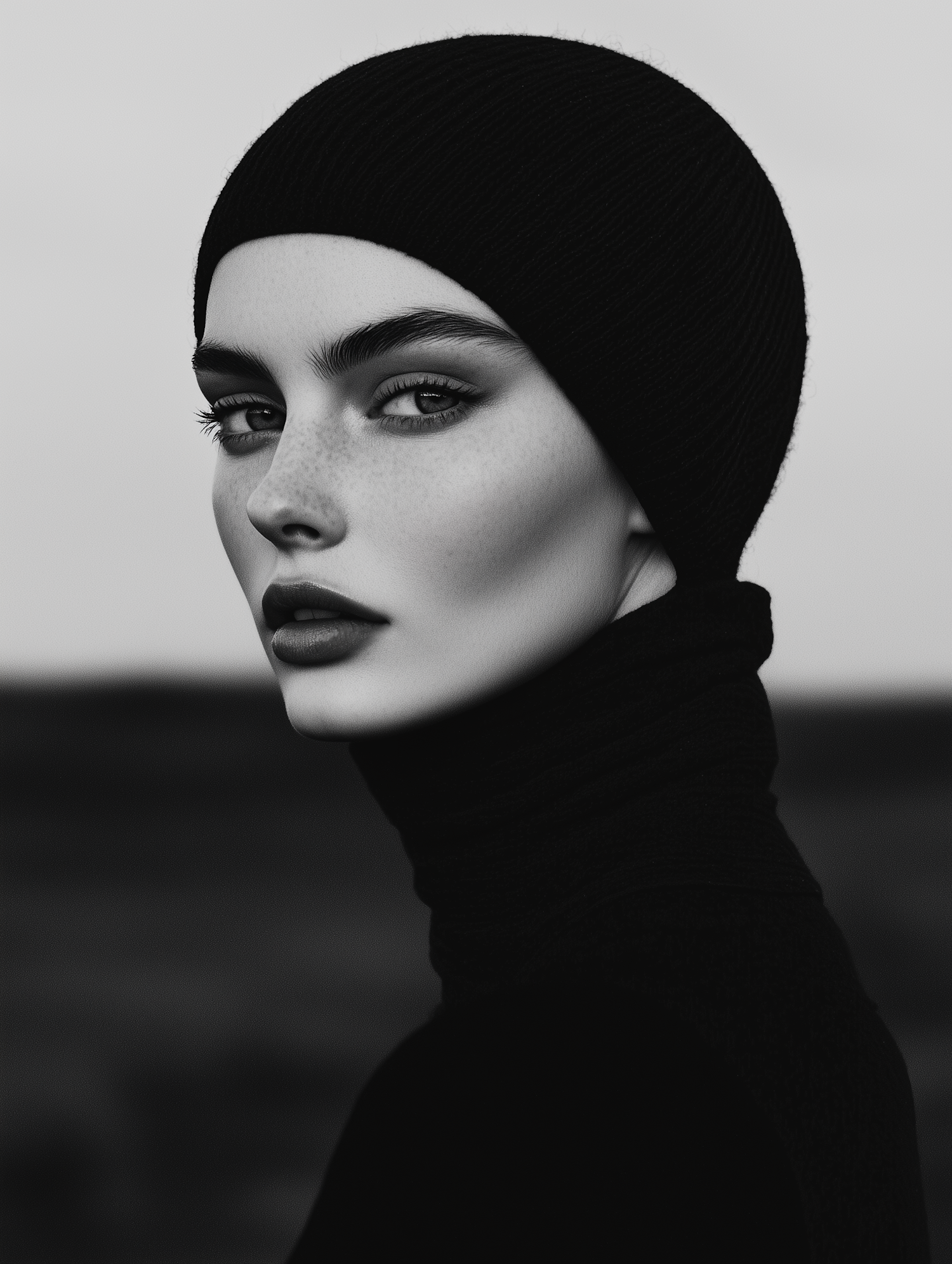 Black and white portrait of a woman with a knit cap and turtleneck, showcasing intense gaze and elegant style.
