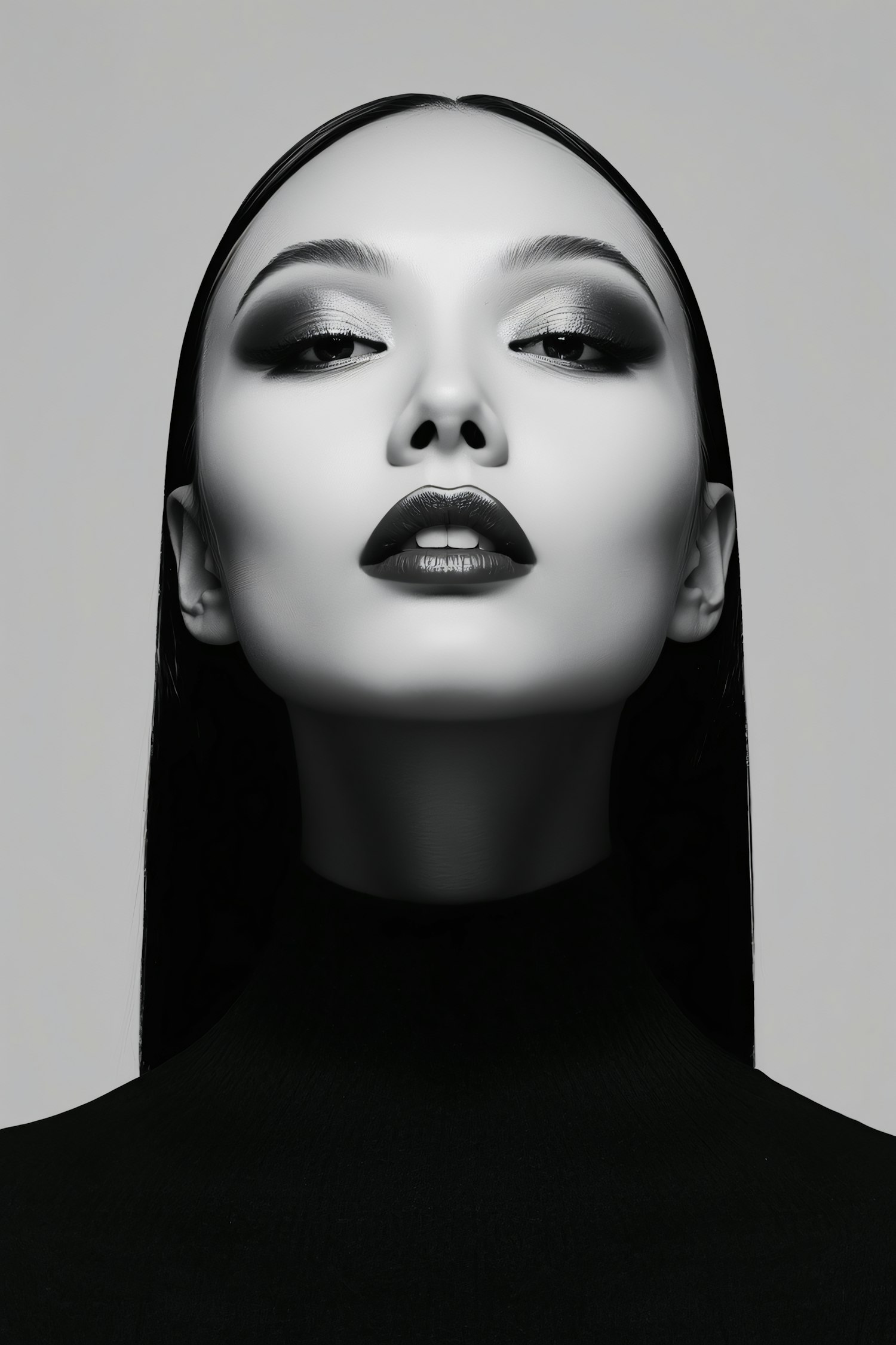 Monochromatic portrait of a person with bold makeup, sleek hair, and a high-necked black outfit against a neutral background.