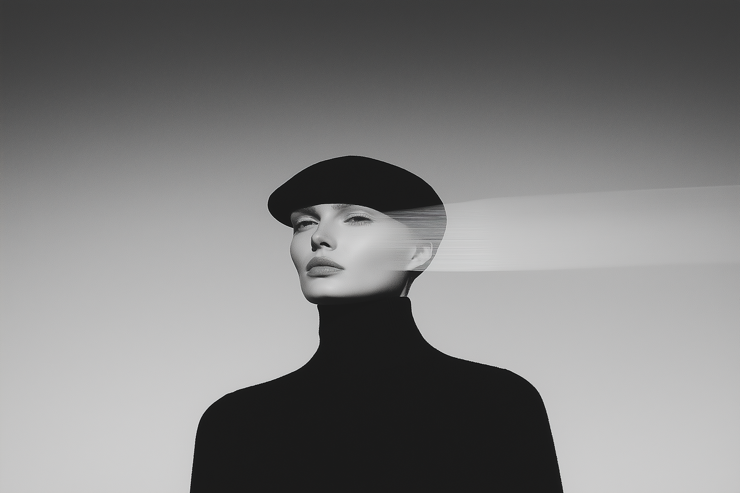 Monochrome portrait with a futuristic vibe, featuring a person in a black beret and turtleneck, with a digital blur effect across the face.