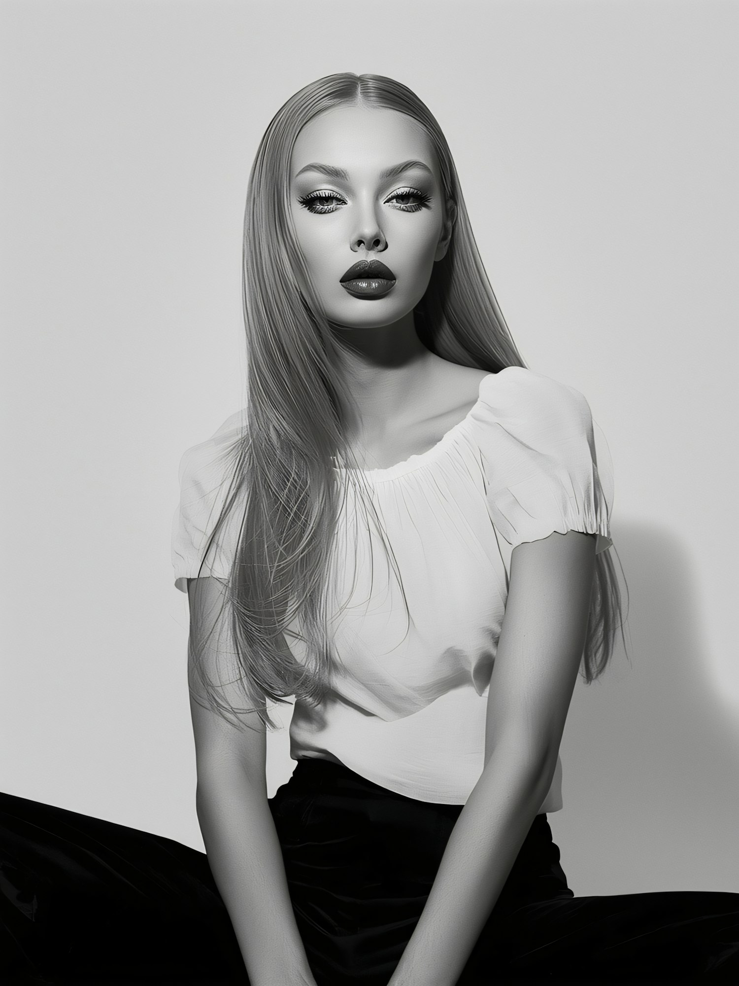 Monochromatic portrait of a woman with long hair, light blouse, and dark pants, gazing directly with a composed expression.
