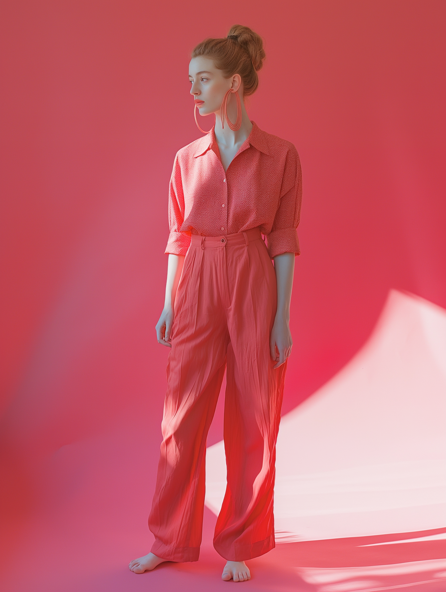 Stylish woman in pink outfit with oversized hoop earrings against a vibrant pink background, exuding elegance and modernity.