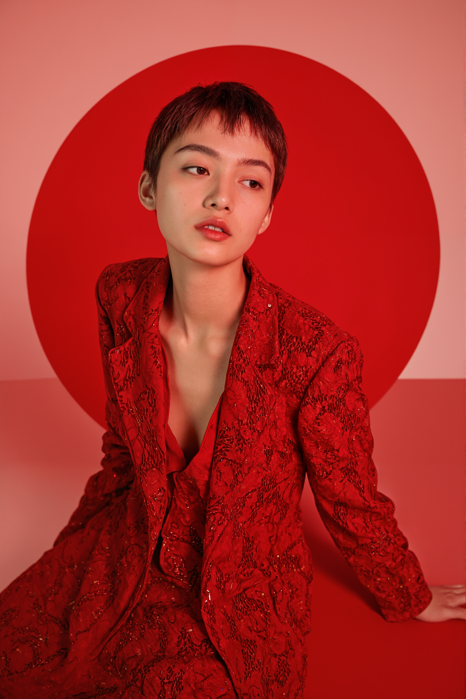 Asian woman in a textured red outfit against a red circular backdrop, exuding elegance and intensity.