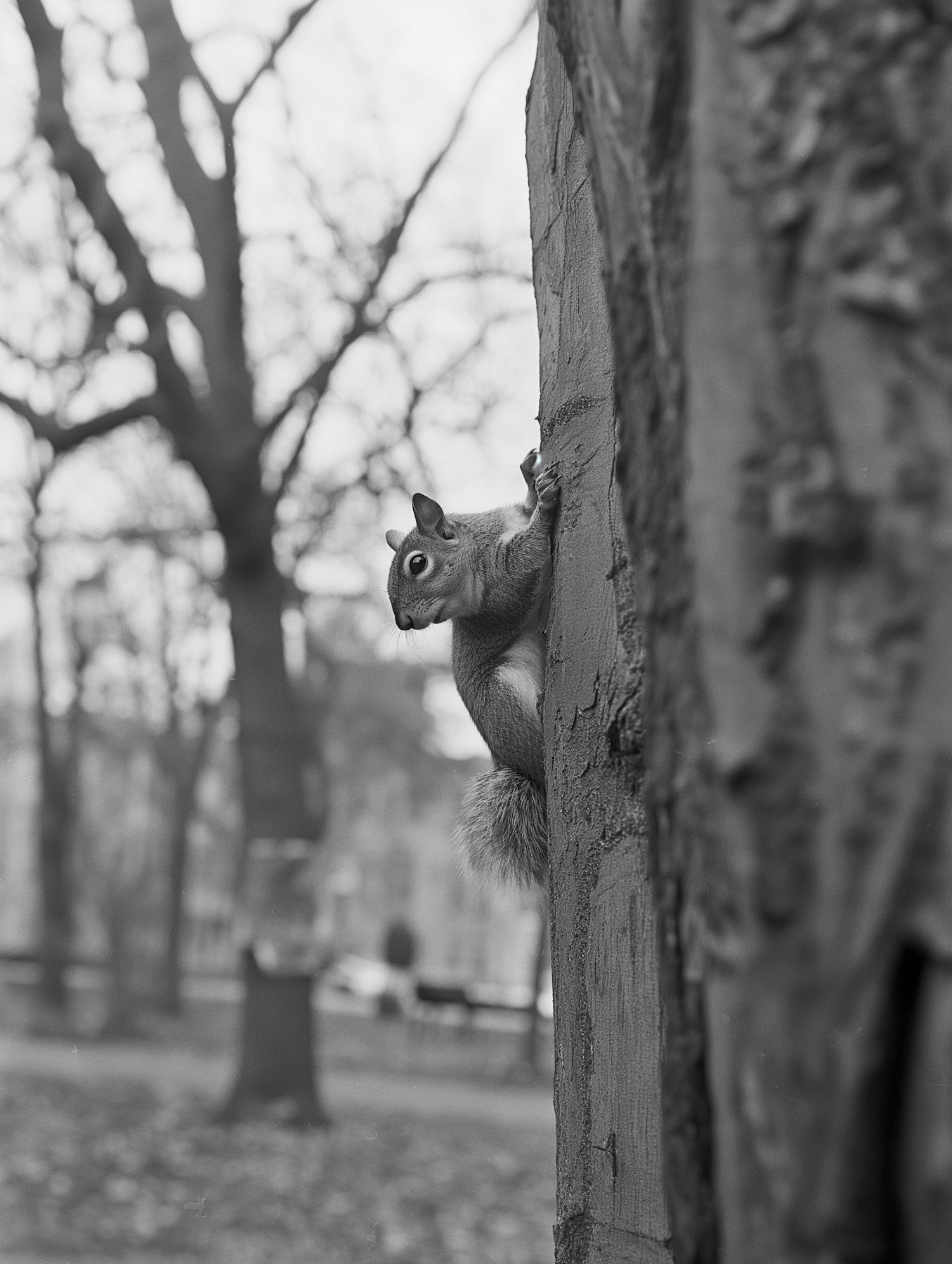 Black and white photo of a squirrel on a tree, with detailed bark texture and blurred park background, creating a serene natural scene.