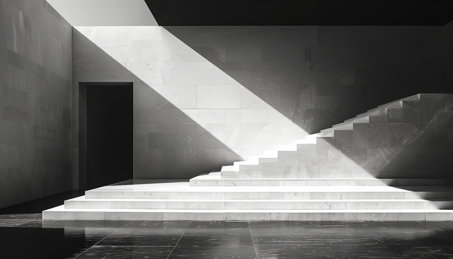 Minimalist architecture with marble stairs and dramatic lighting, highlighting geometric shapes and contrasts in a serene setting.