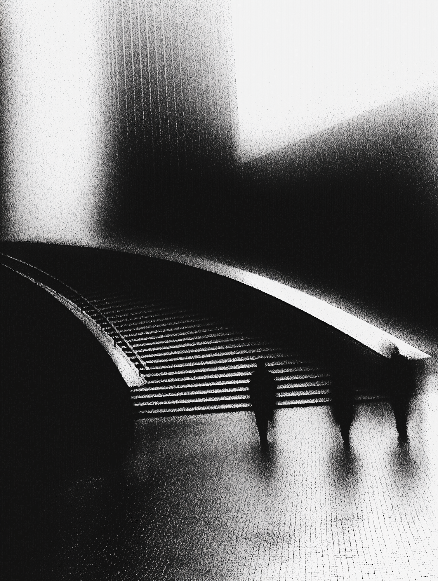 Surreal monochrome scene with blurred figures approaching illuminated stairs, creating a mysterious and dreamlike atmosphere.