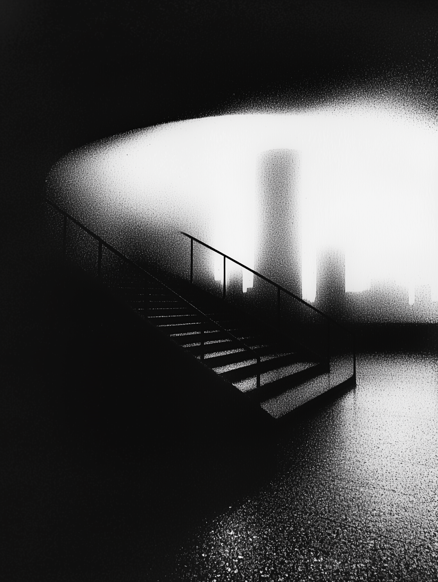 Monochrome image of a staircase with city skyline silhouette, dramatic light and shadow contrast, and textured floor reflections.