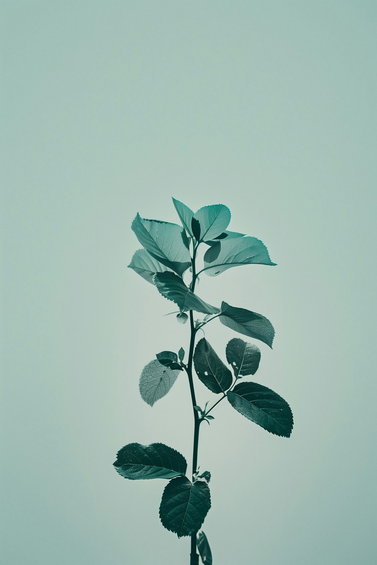 Minimalistic plant stem with detailed leaves against a muted green background, creating a serene and organic aesthetic.