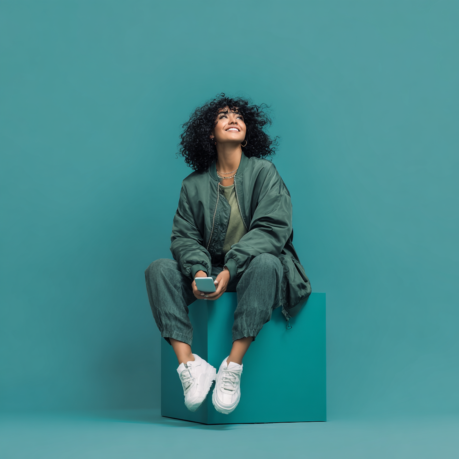 Stylish woman in green outfit sitting on a teal cube, holding a phone, and smiling against a matching teal background.