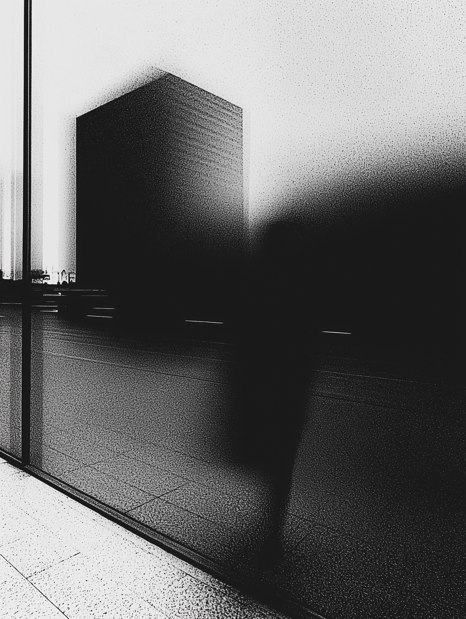 Abstract monochrome image with a blurred building and shadowy figure, creating a mysterious and moody atmosphere.