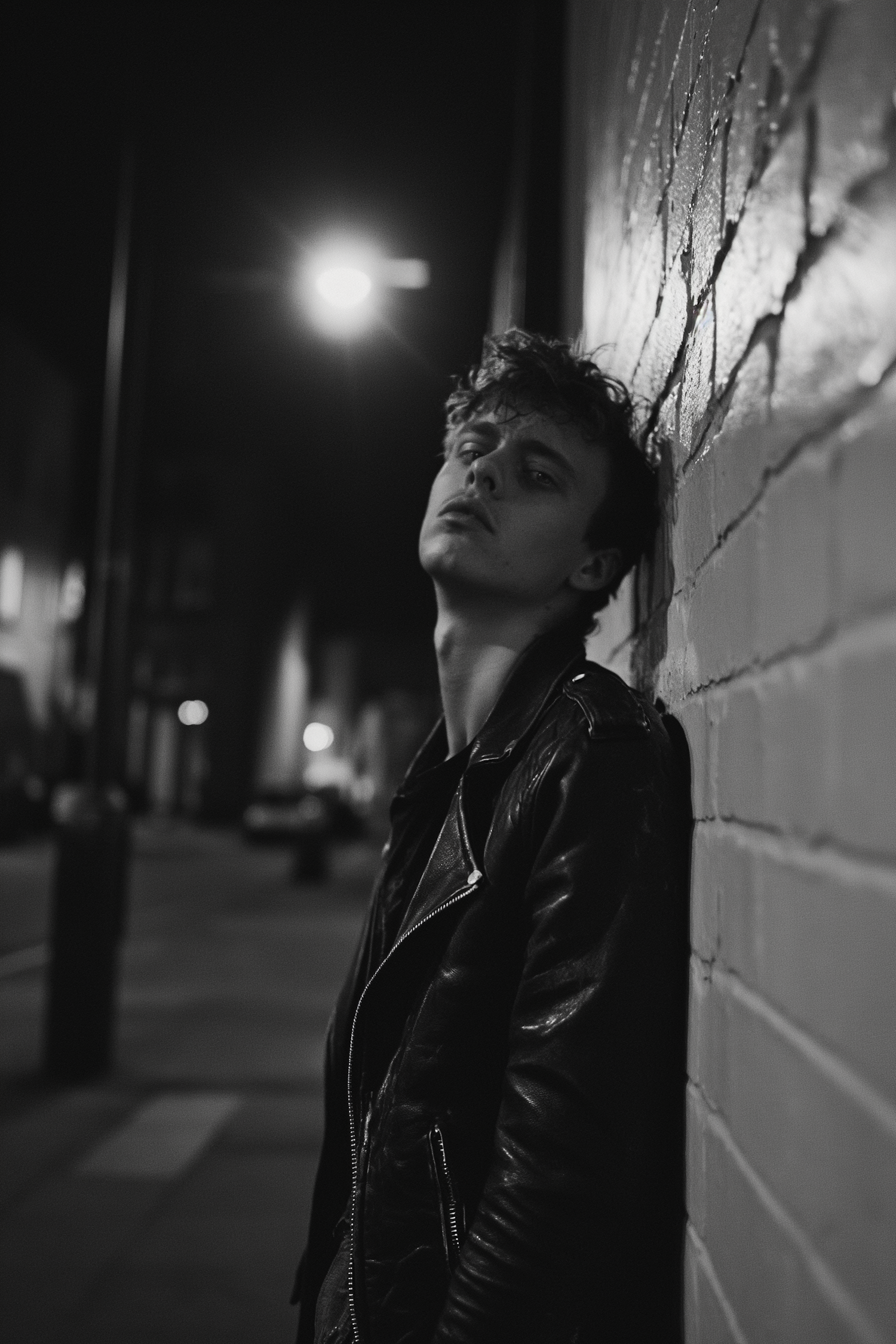 Moody black-and-white portrait of a young man in a leather jacket leaning against a wall at night.