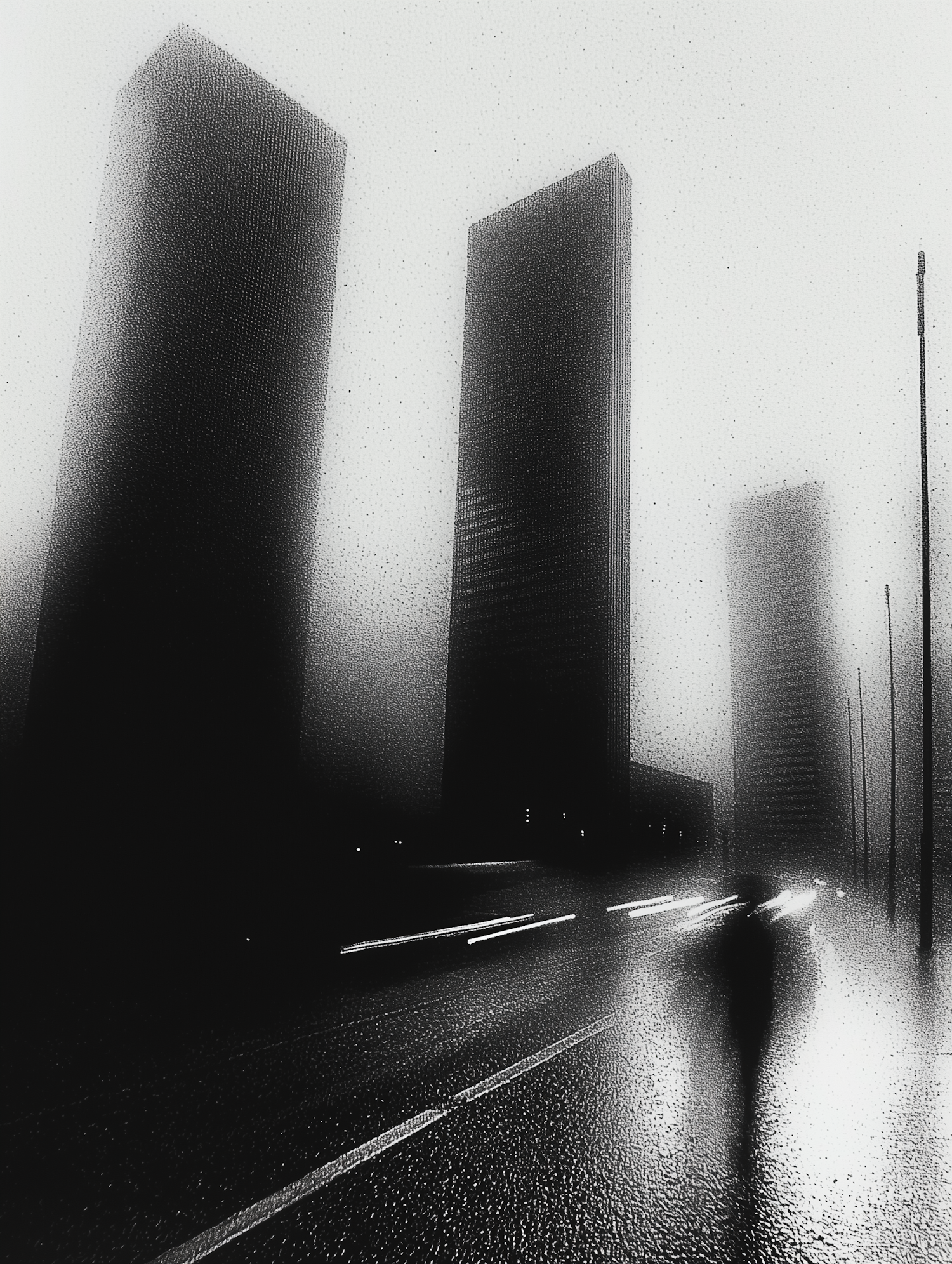 Moody urban scene with towering skyscrapers in mist, a lone figure on a rainy street, and dramatic lighting reflections.