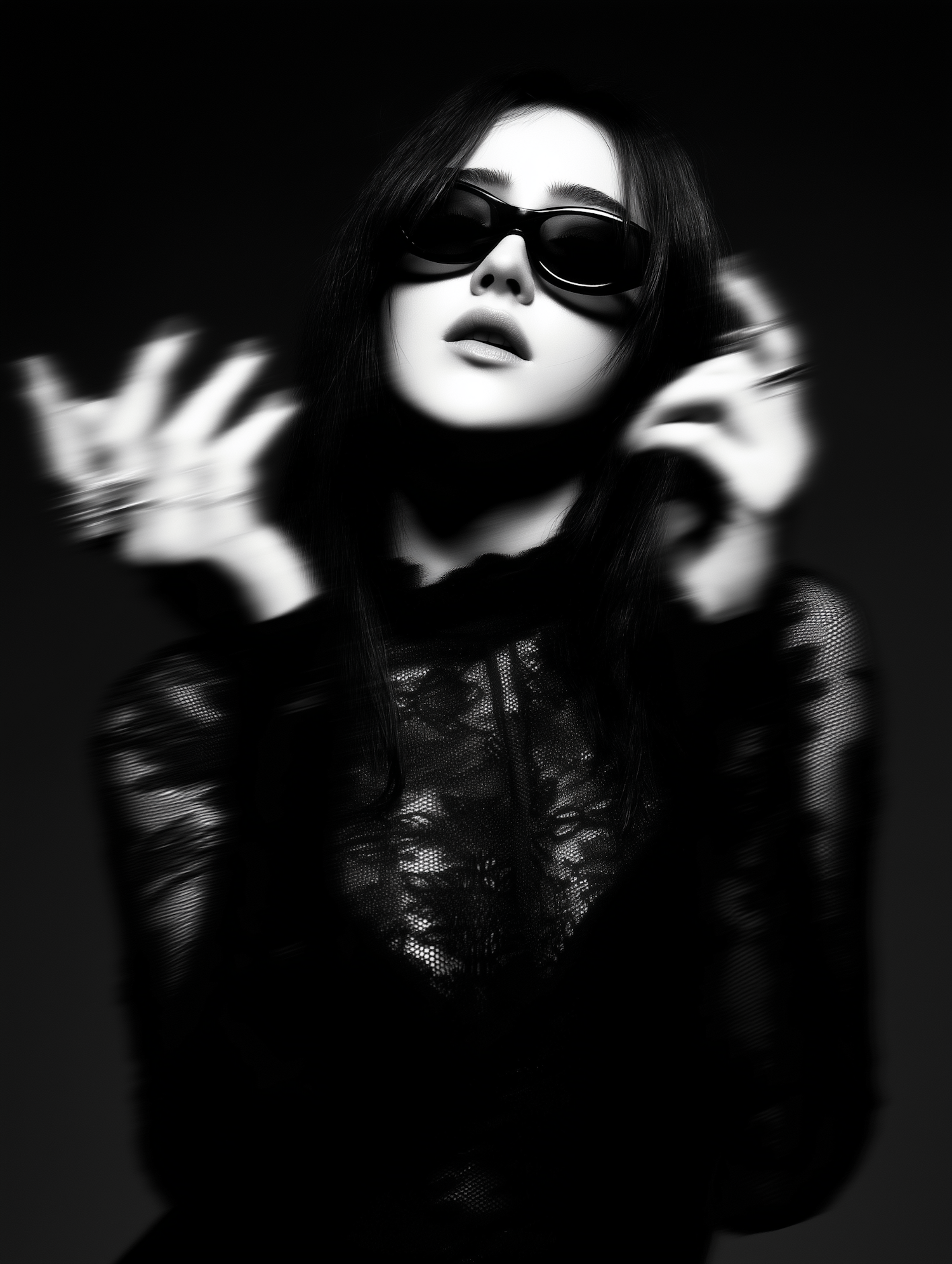 Monochrome portrait of a woman in lace, wearing sunglasses, with dramatic lighting and motion-blurred hands for an edgy, mysterious vibe.