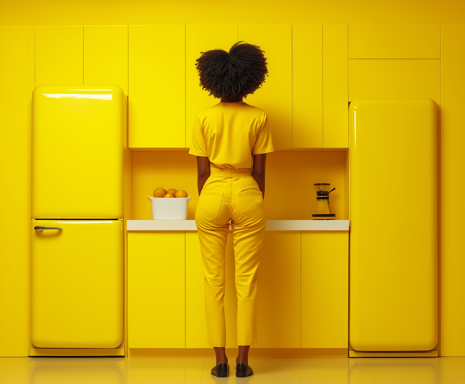 Woman in yellow outfit stands in a vibrant yellow kitchen, blending with the decor. A bowl of oranges and a coffee maker add contrast.