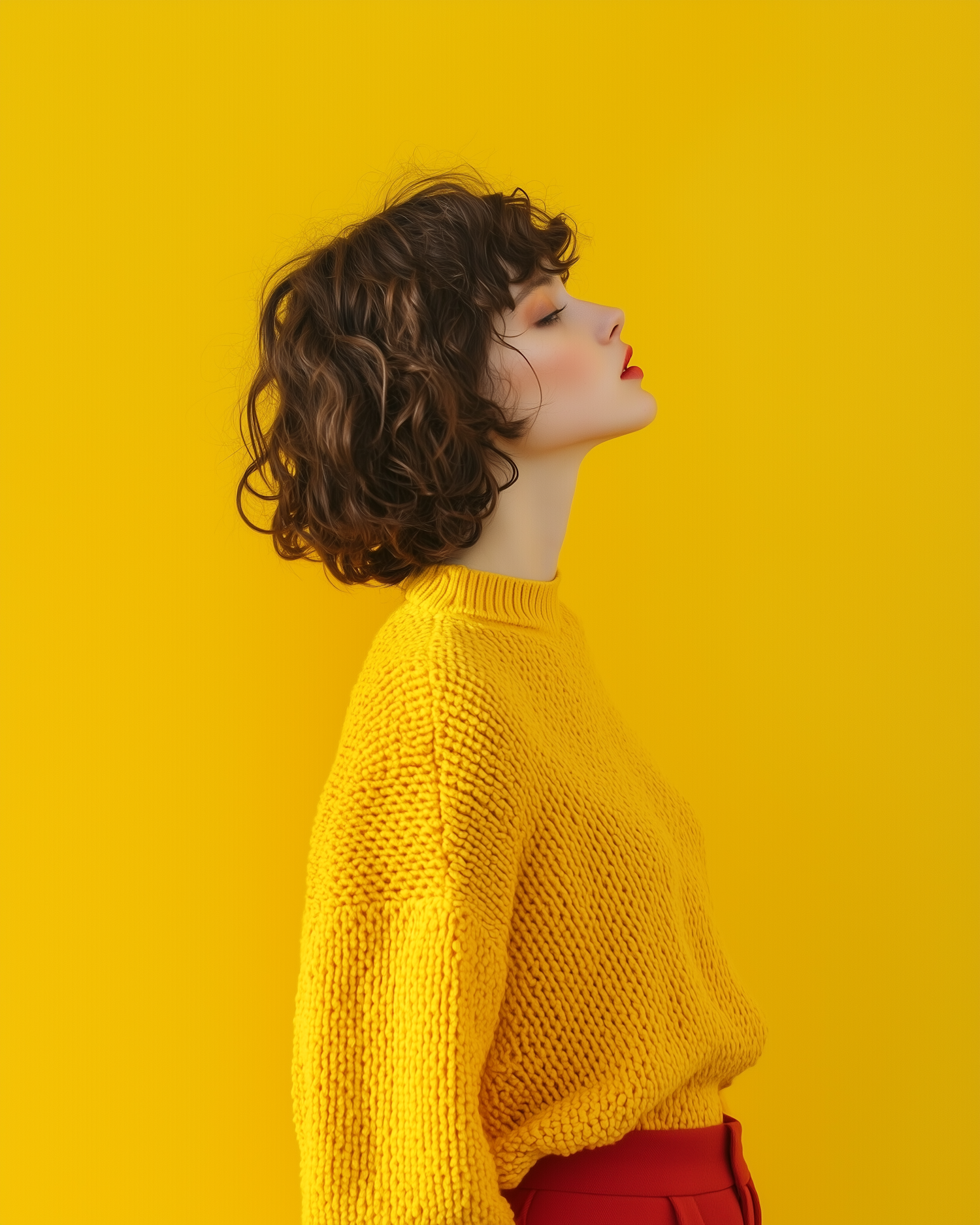 Stylish woman in a yellow sweater and red pants against a vibrant yellow background, showcasing bold colors and a serene profile pose.
