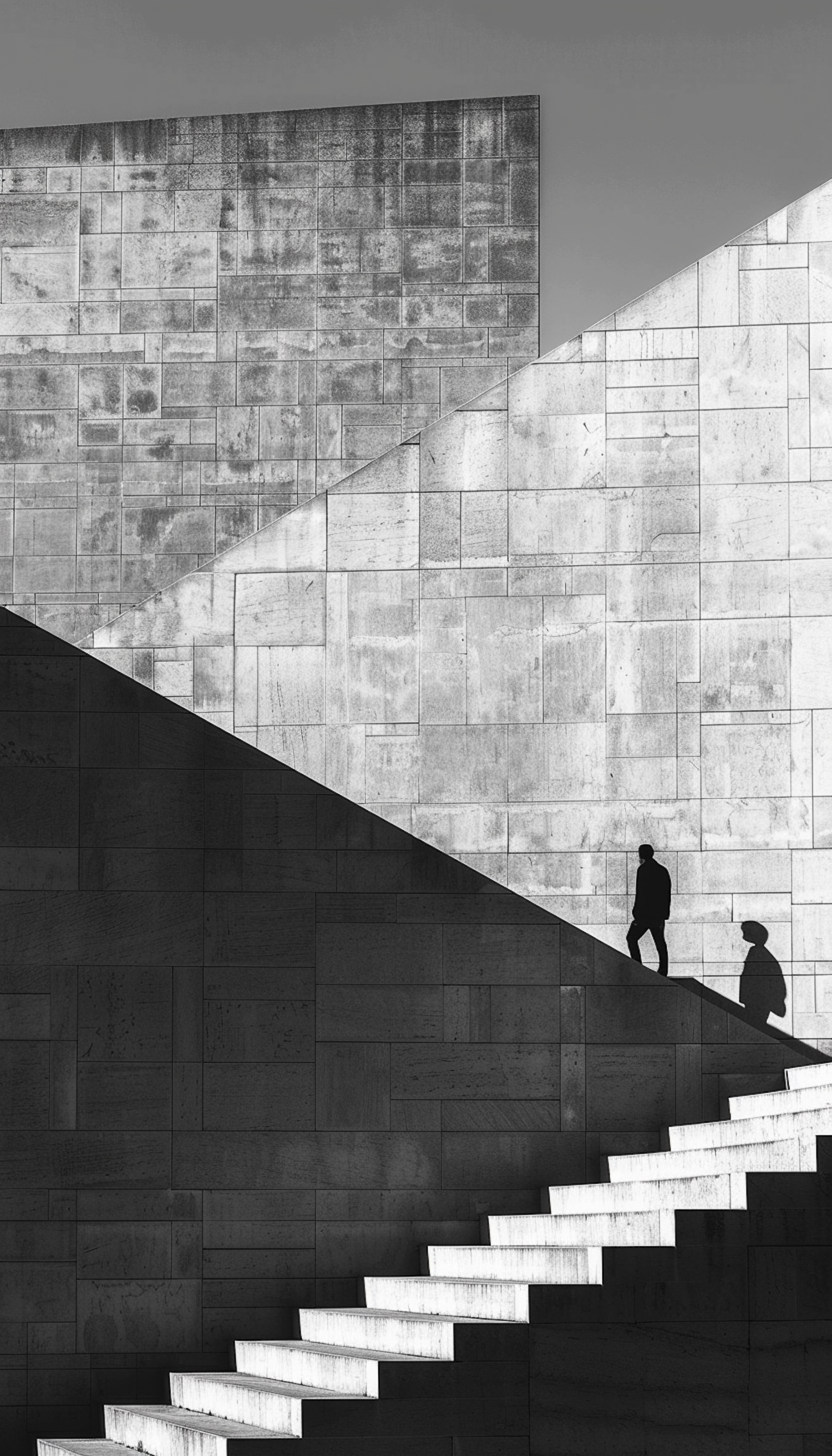 Minimalist black-and-white photo of stairs, geometric walls, and two silhouettes ascending, emphasizing light and shadow contrast.