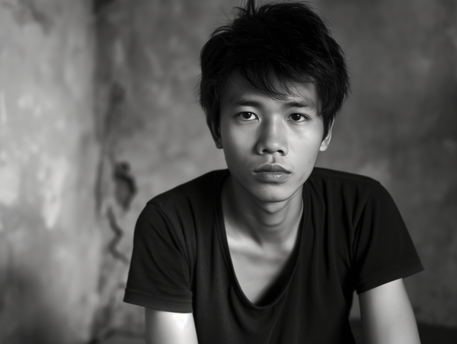 Monochrome portrait of a young Asian man with tousled hair and a neutral expression, wearing a black t-shirt against a textured background.