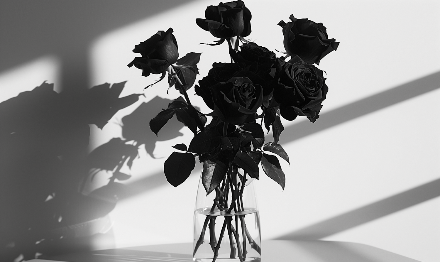 Elegant black roses in a clear vase against a white background, casting dramatic shadows.
