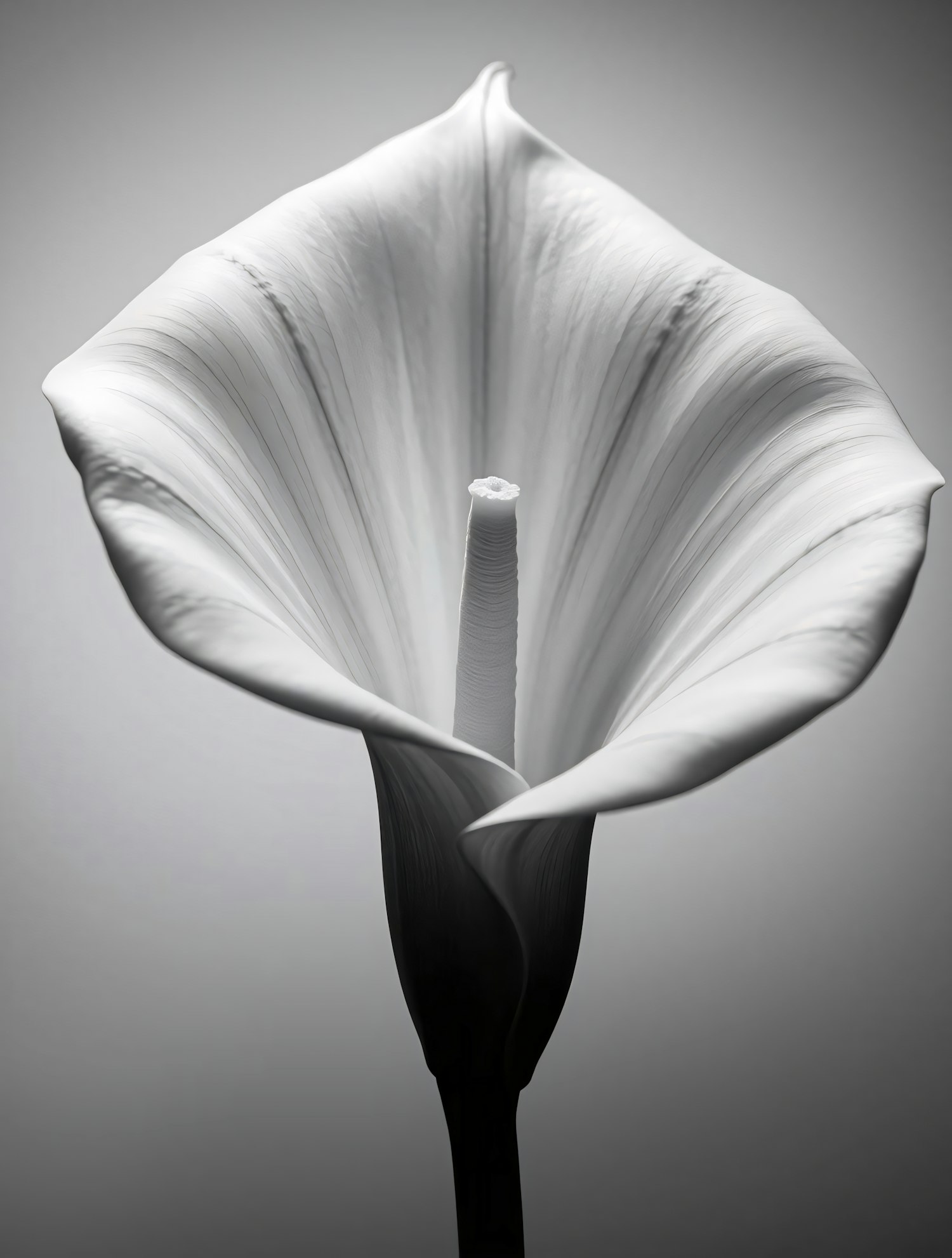 Monochromatic close-up of a calla lily, highlighting its smooth petals and central spadix with soft, diffused lighting.