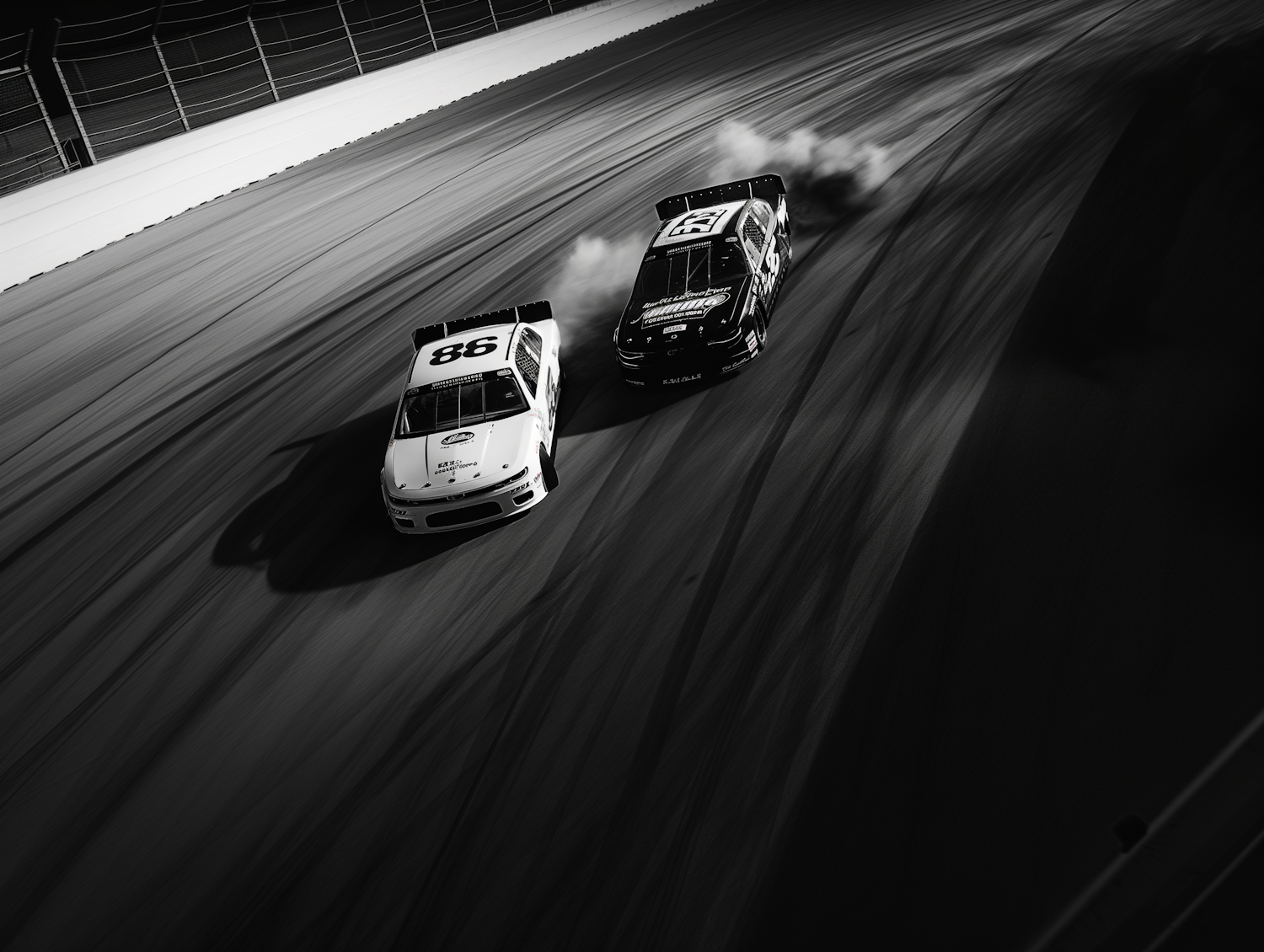 Two race cars, numbers 86 and 13, speed side by side on a track in a dramatic black and white scene.