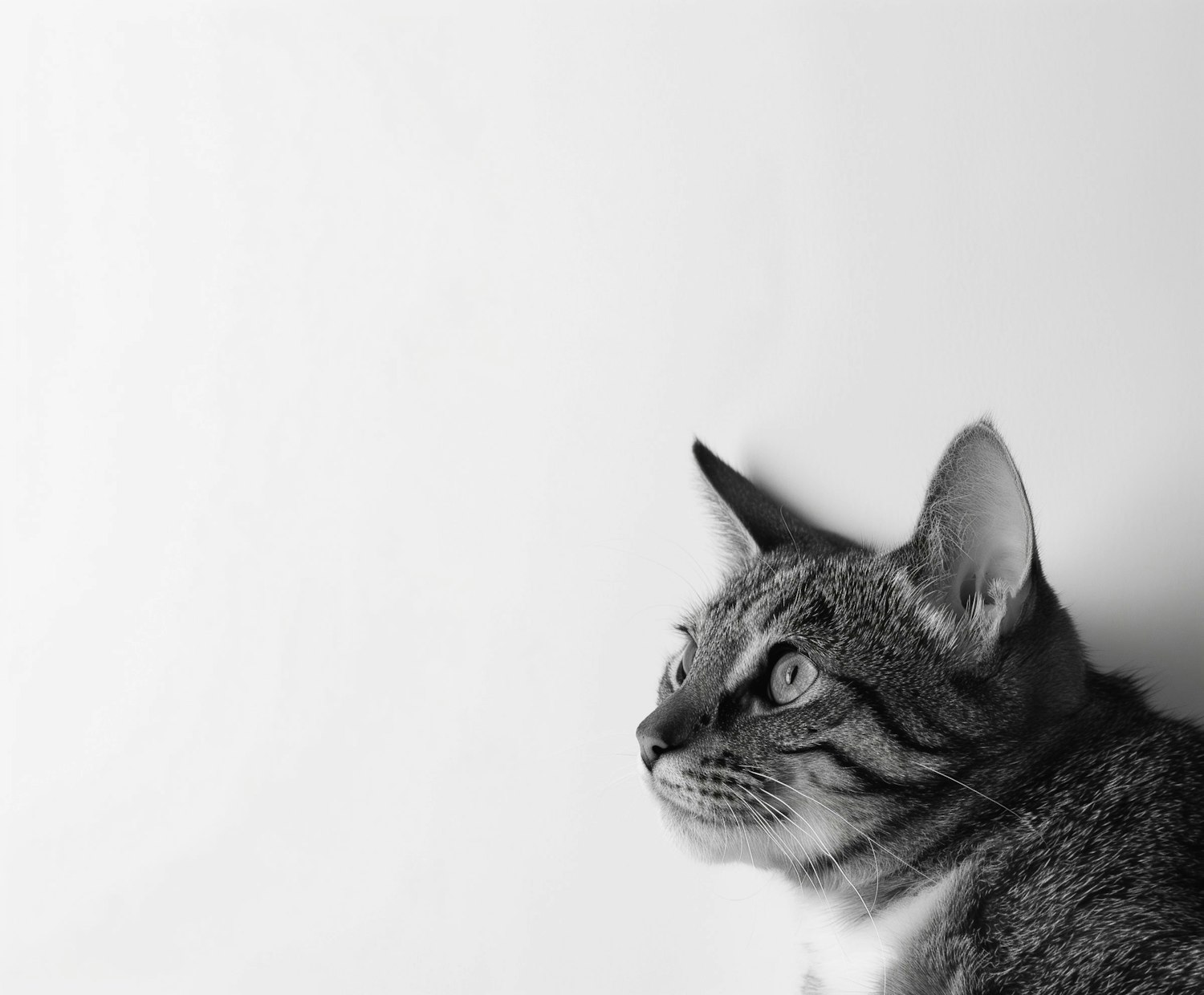 Black and white close-up of a tabby cat with detailed fur patterns, gazing intently to the right against a plain background.