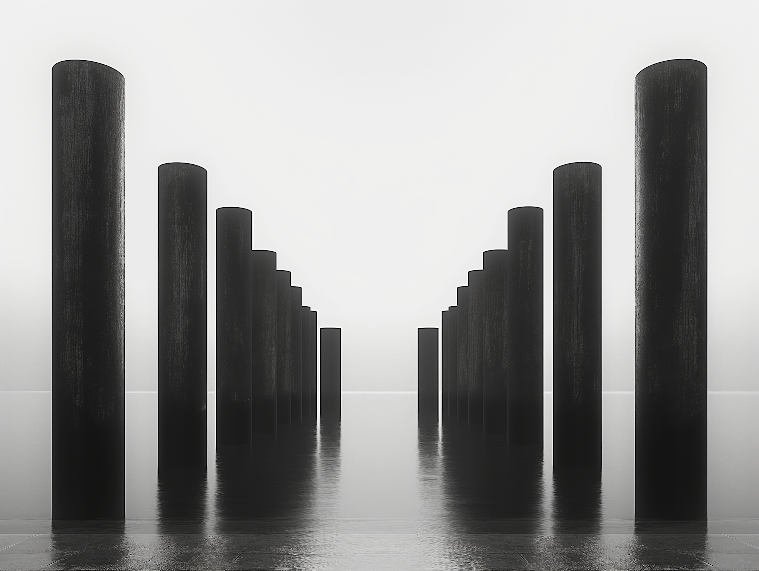Symmetrical black pillars reflected in water, creating a minimalist and serene geometric composition.