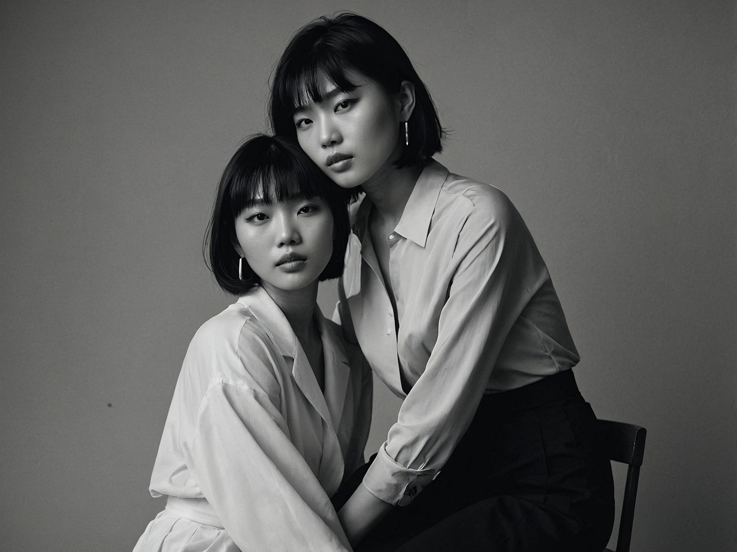 Elegant black-and-white portrait of two Asian women in minimalist outfits, showcasing natural beauty and a serene connection.