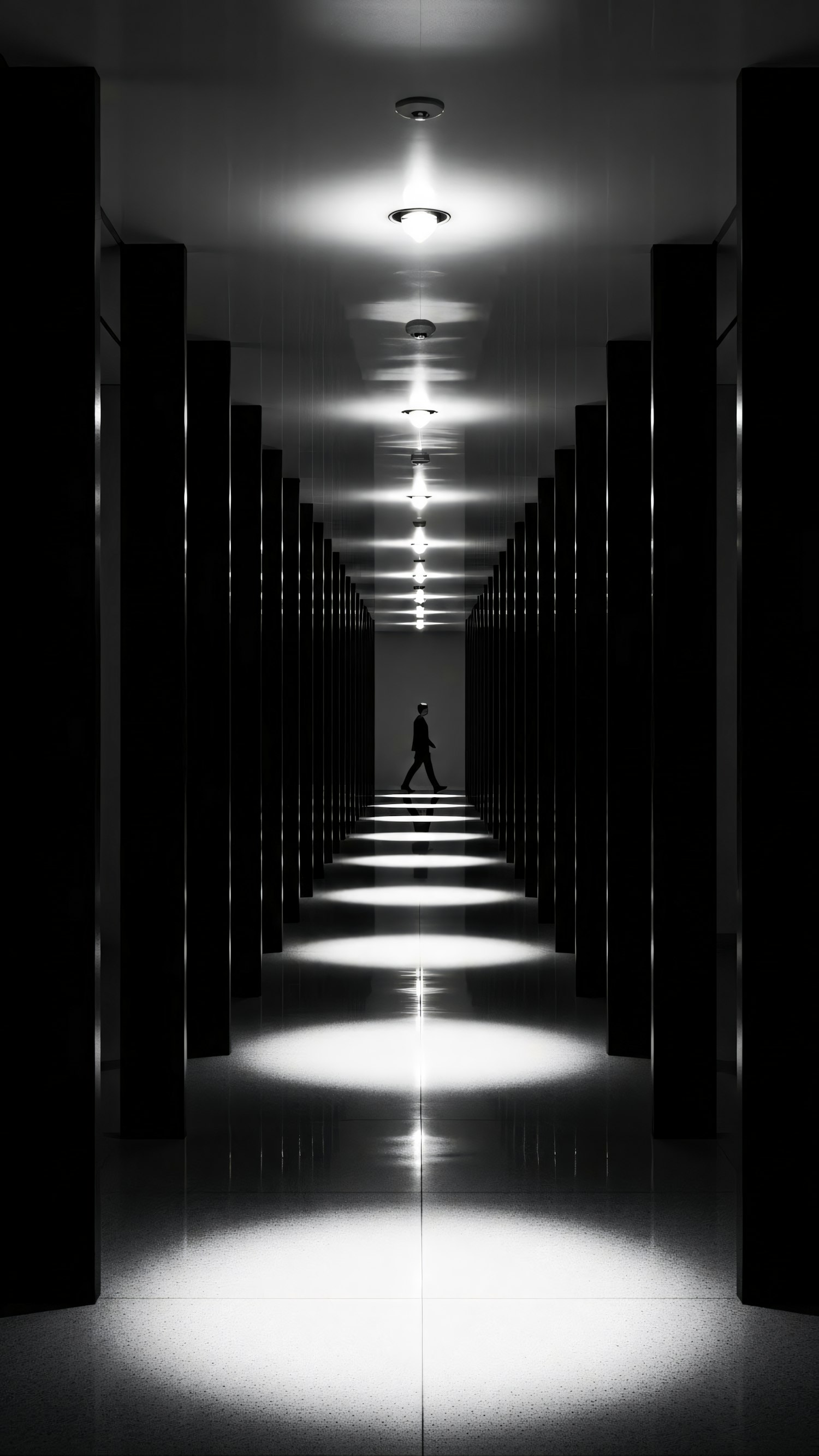 A striking black-and-white photo of a corridor with dramatic lighting and a lone figure walking in the distance.