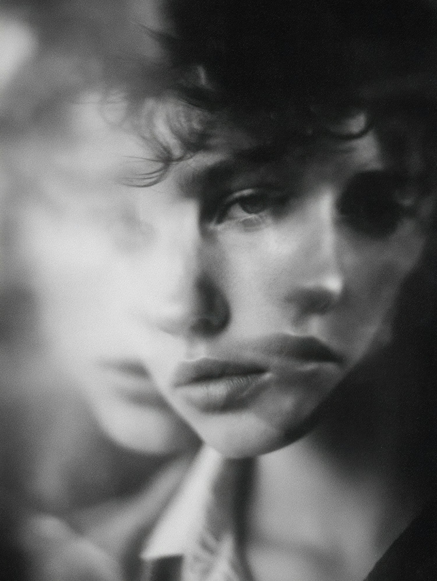 Monochrome photo with a double exposure effect, capturing a close-up of a softly-focused face with an ethereal and dreamy aesthetic.
