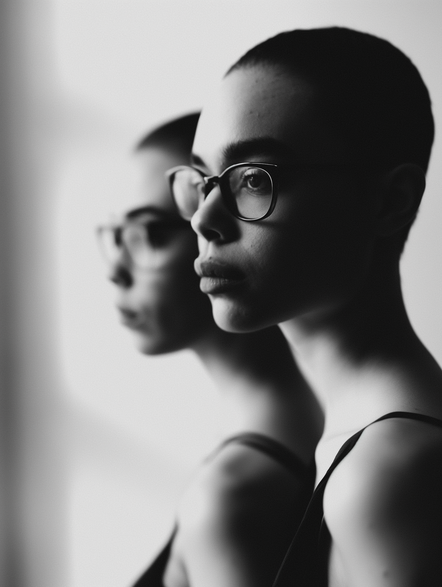 Black and white portrait of a young woman with glasses and a shaved head, reflecting introspectively in soft lighting.