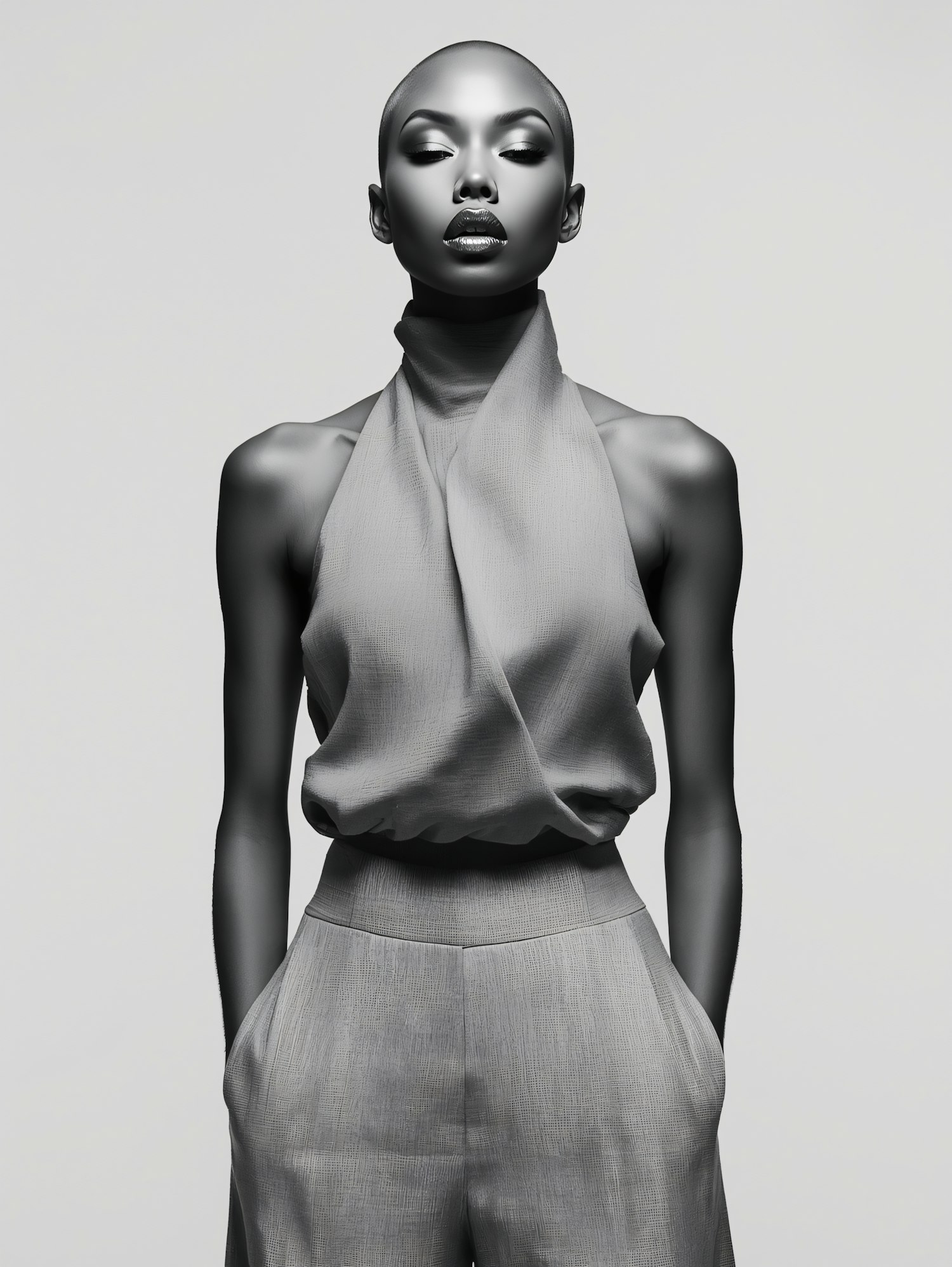 Monochromatic portrait of a person in elegant attire, showcasing a high-neck top and textured trousers against a plain background.