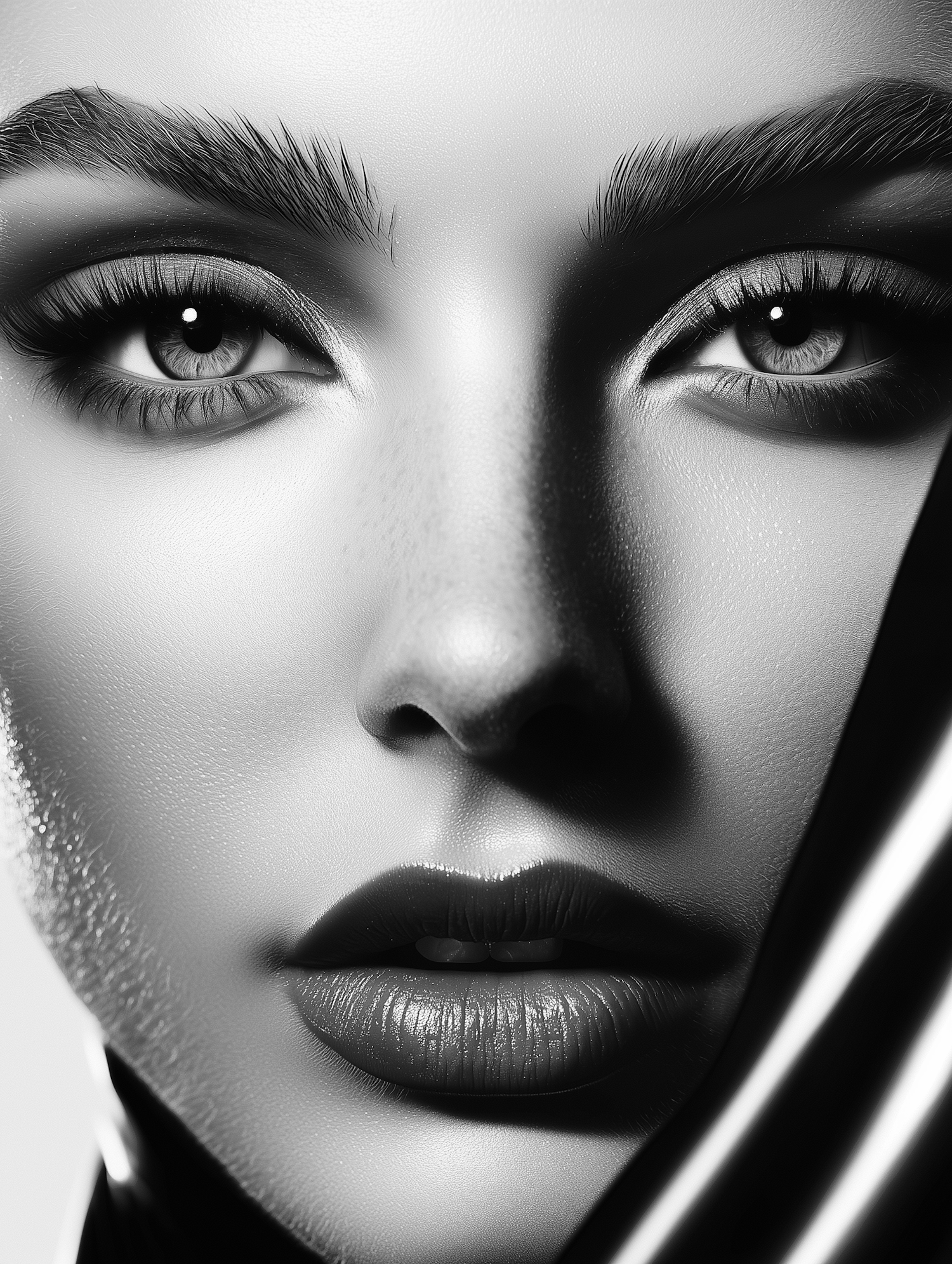 Striking black and white close-up of a woman's face, highlighting her expressive eyes and full lips with dramatic lighting.