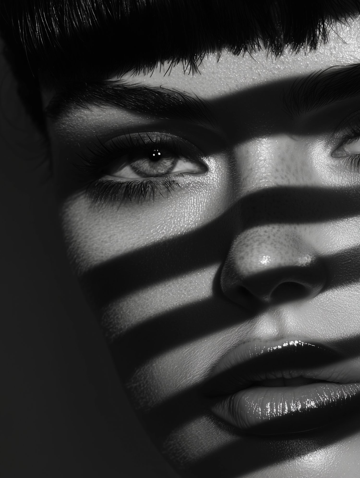 Black and white close-up of a face with dramatic shadows and glossy lips, highlighting eyes and texture.