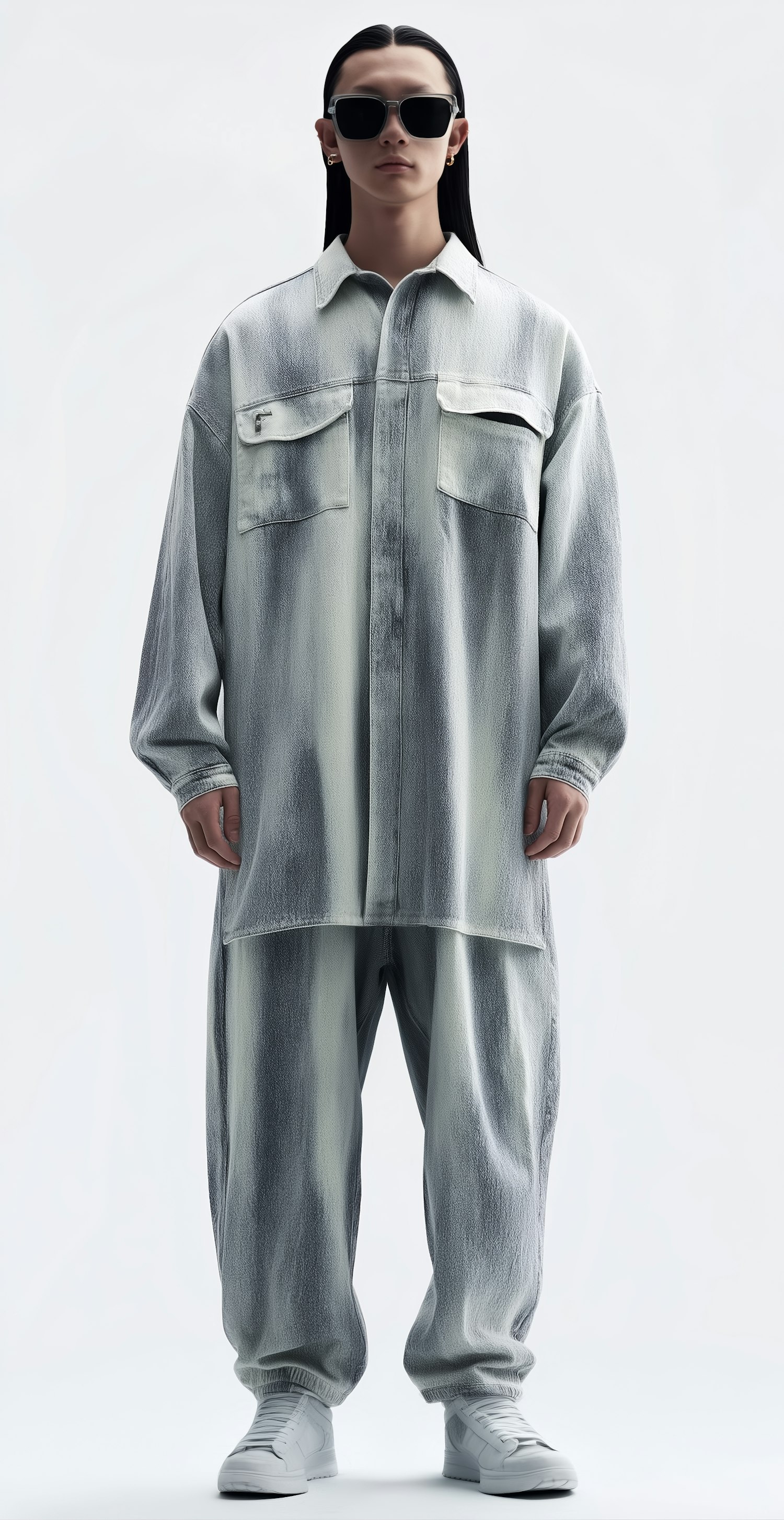 A stylish individual in a gray gradient outfit with sunglasses and white sneakers, showcasing a modern and minimalistic fashion style.