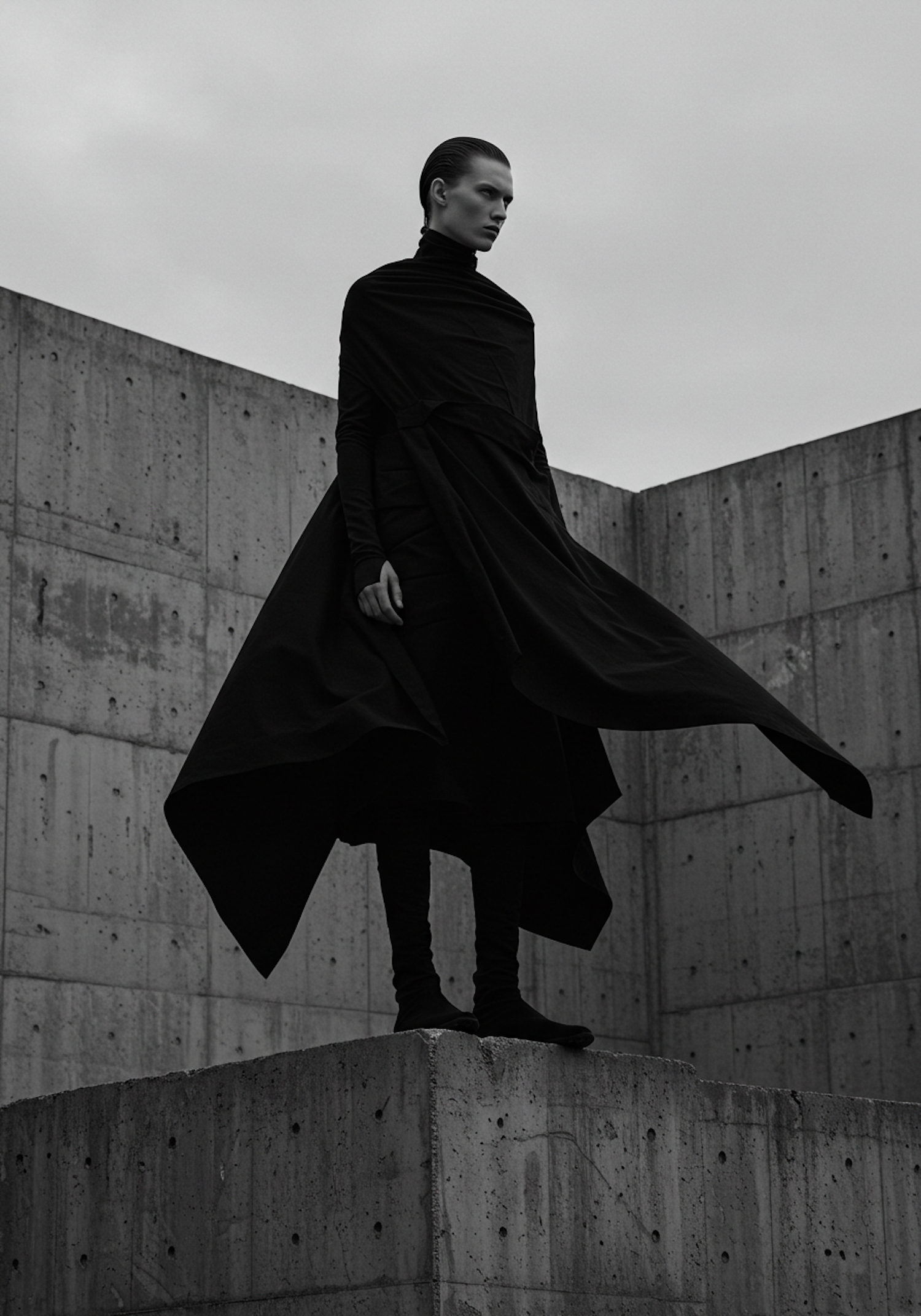 Striking monochrome shot of a person in flowing black avant-garde fashion, standing on a concrete platform against an overcast sky.