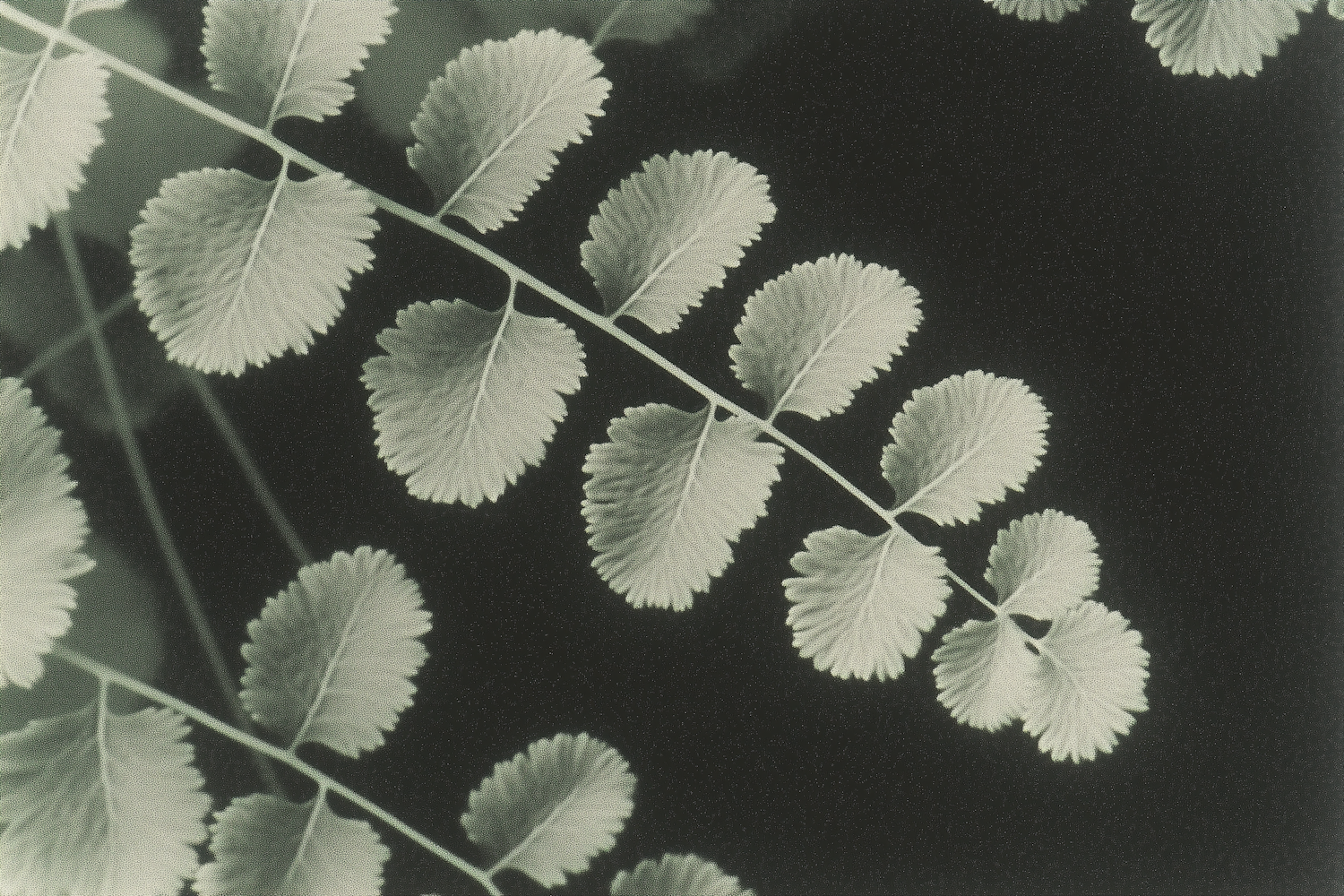 Monochromatic close-up of fern-like leaves with serrated edges against a black background, showcasing intricate details and symmetry.