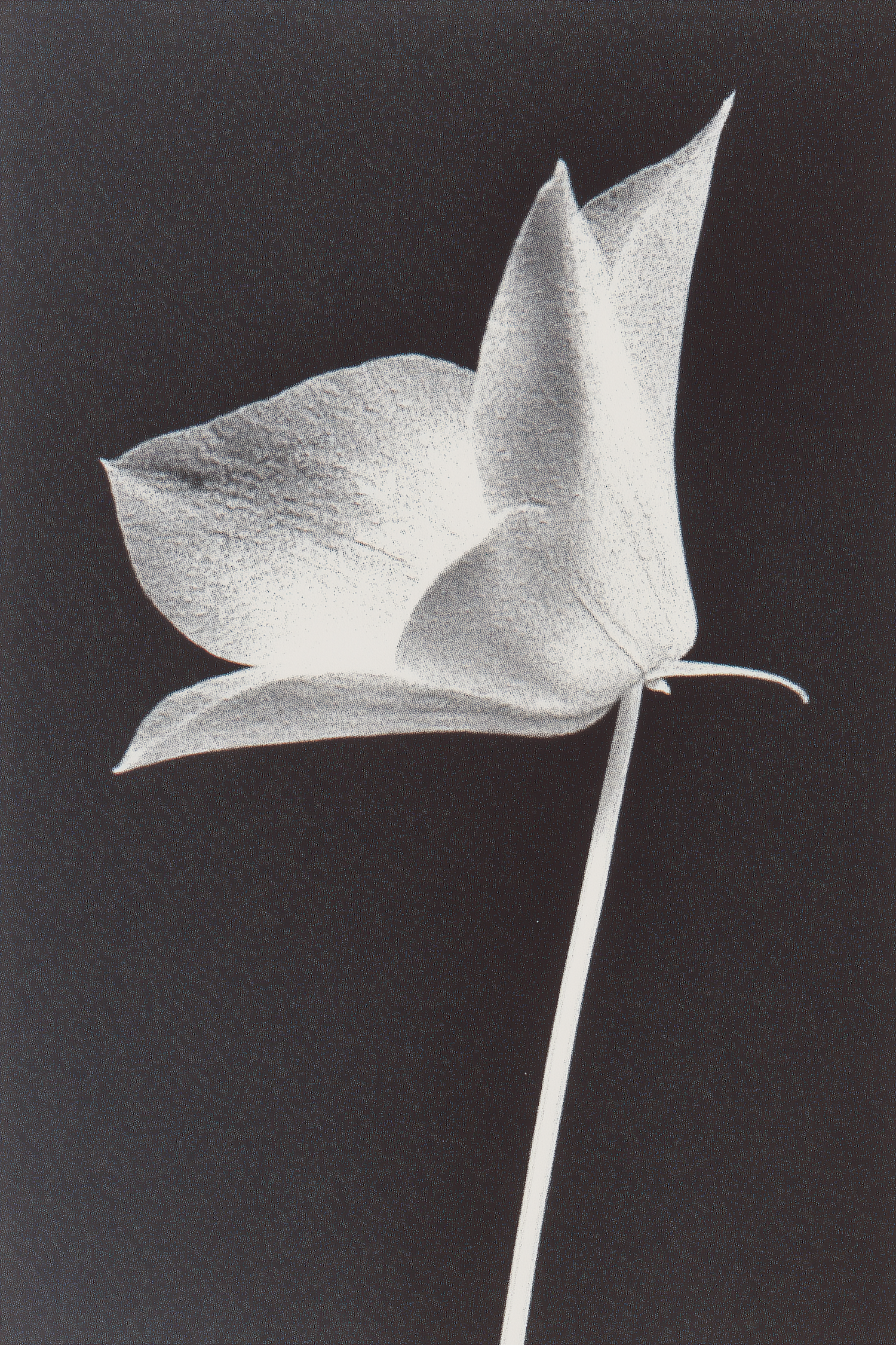 Minimalistic black-and-white image of a single flower with delicate petals and a slender stem against a dark background.